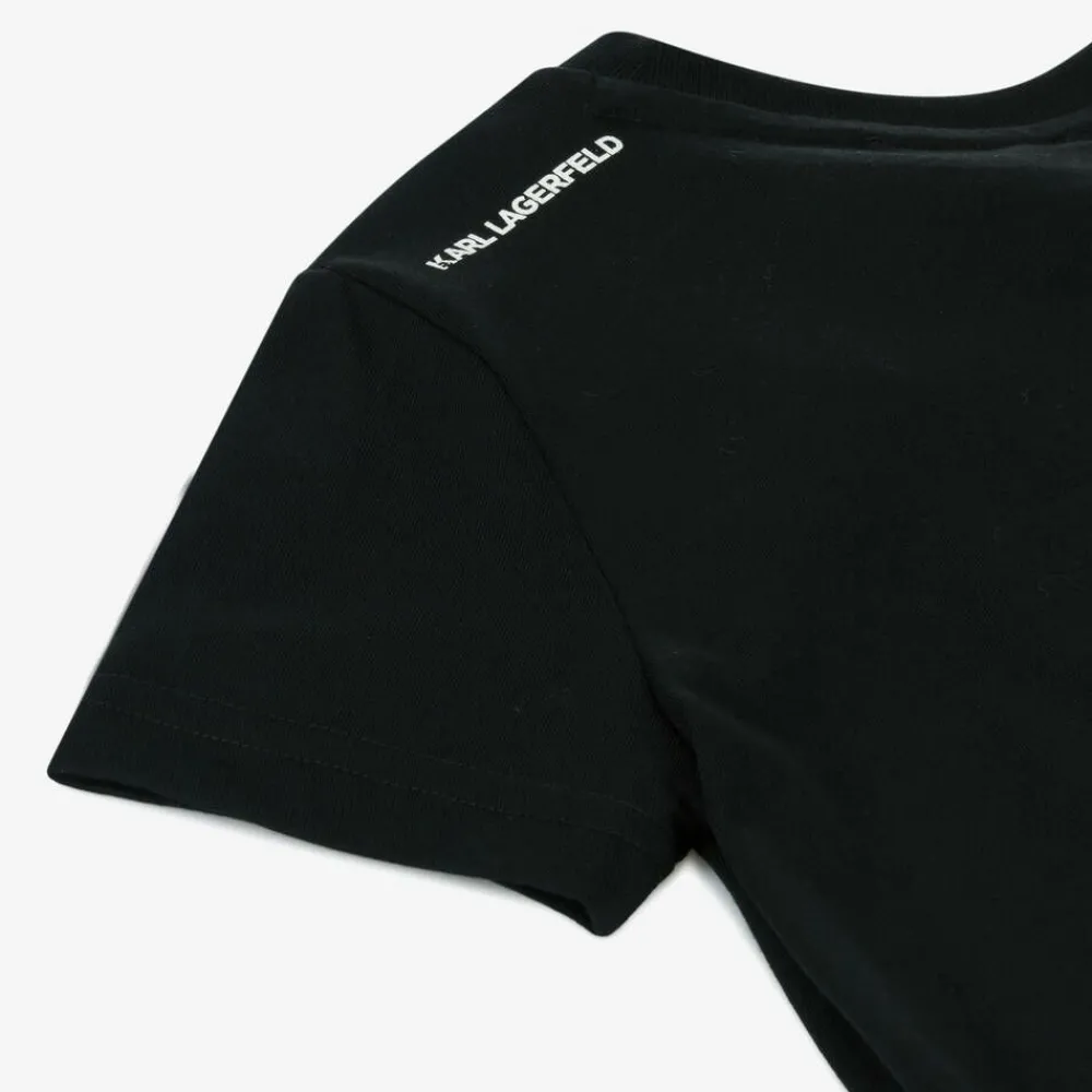 Classic, black organic cotton T-shirt for boys by KARL LAGERFELD KIDS. For instant brand recognition, it has a white, 3D logo printed on the chest, and another logo printed on the back of one shoulder. Ideal for casual, relaxed days, this short-sleeved tee is made in soft, comfortable jersey.