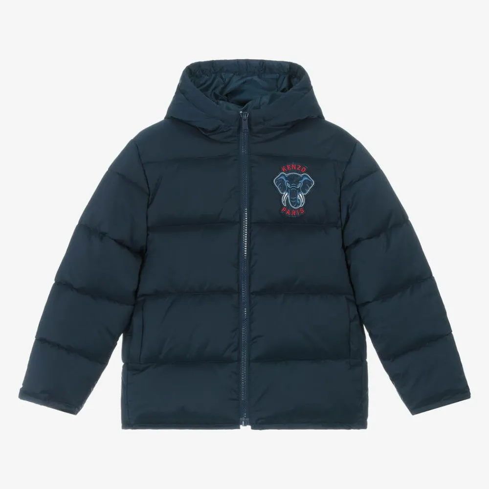 This cosy navy blue hooded puffer coat for boys and girls is by luxury French brand KENZO KIDS. For instant designer appeal, it has the iconic Elephant logo badge embroidered on the front in blue and red. Warmly padded and water repellent, it has side seam pockets and a branded zip fastening on the front. It is fully lined in satin for comfort.