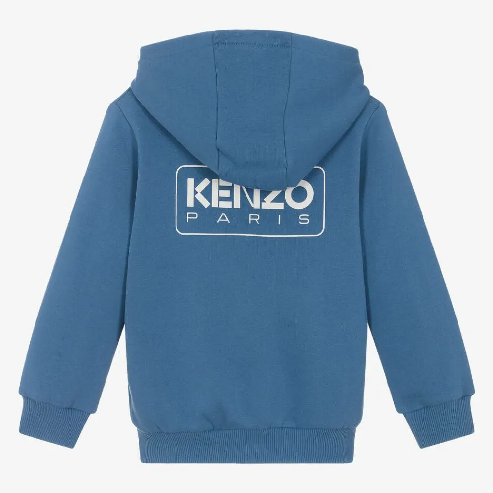 Blue hooded zip-up top for boys and girls by KENZO KIDS, made in soft mid-weight organic cotton jersey with a warm, fleecy inside. Casual and comfortable, it has cosy ribbed trims, front pockets and a branded zip fastening. For instant brand recognition there is a large Kenzo Paris logo printed on the back in white, with a matching, smaller print on the chest.