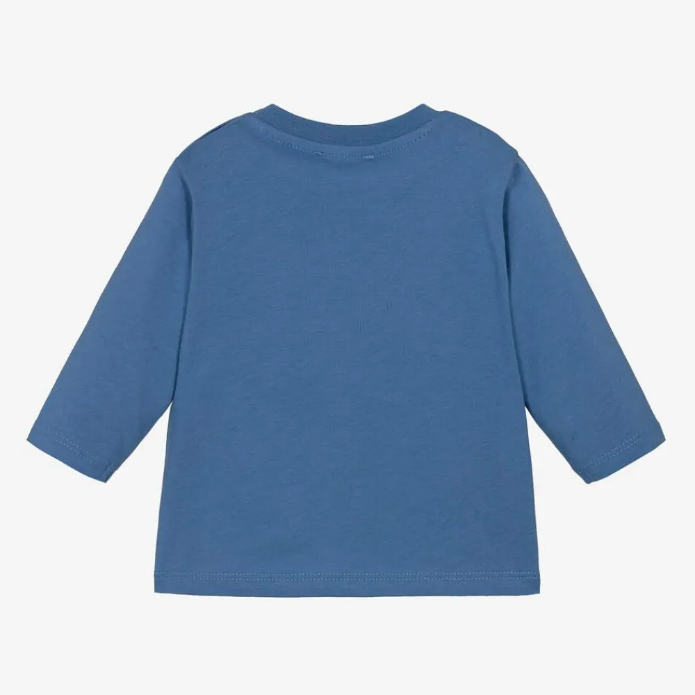A blue long-sleeved T-shirt for little boys by KENZO KIDS, printed with a white logo on the front. This casual top is made from comfortable organic cotton jersey with branded poppers to fasten on one shoulder, making over-the-head dressing easier.