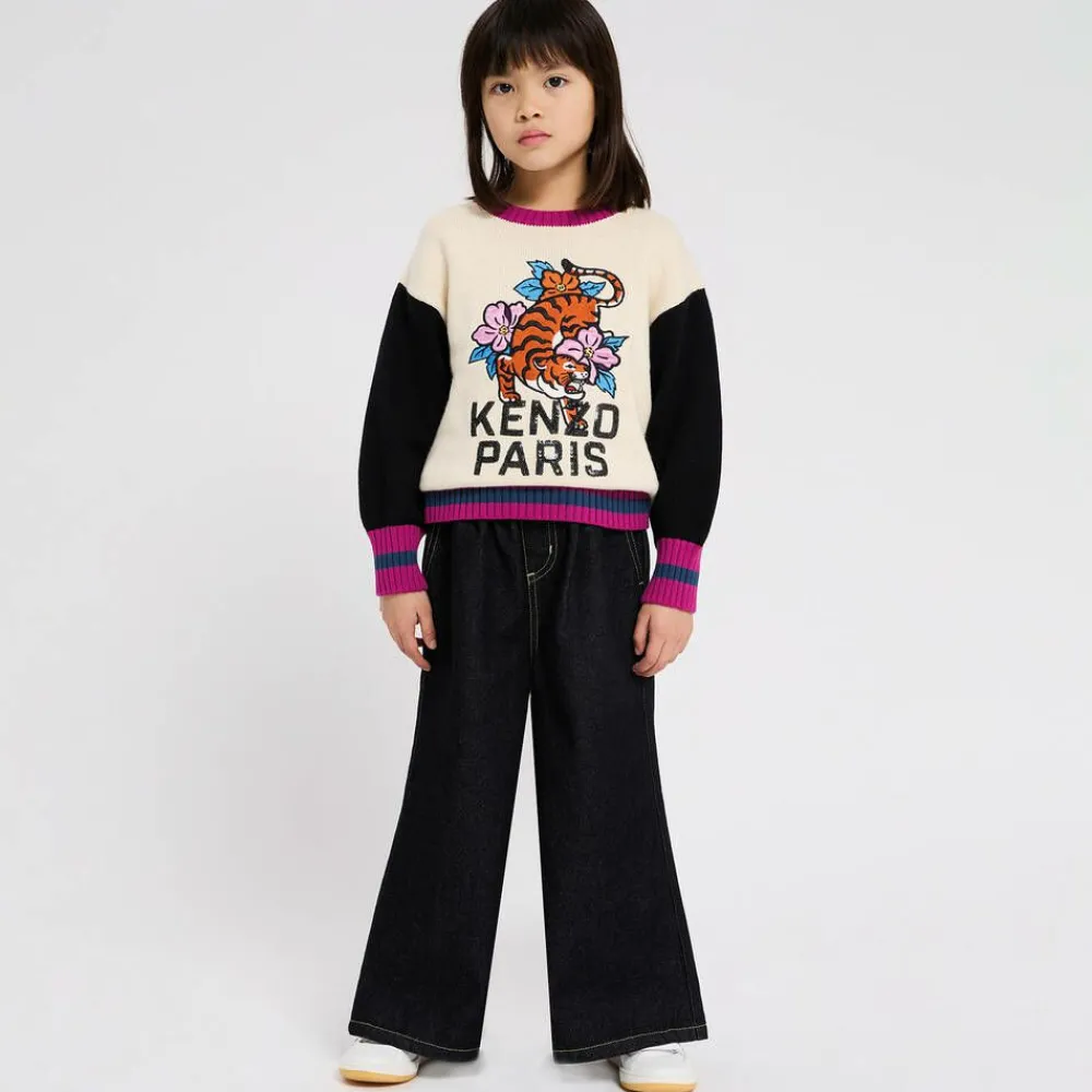 Ivory sweater for girls by KENZO KIDS, knitted in a soft cotton and wool blend. Embroidered with cartoon-style flowers, this distinctive piece has long black sleeves and magenta pink striped trims. An orange tiger on the front adds an emblematic statement, joined by a sequin Kenzo Paris logo below.