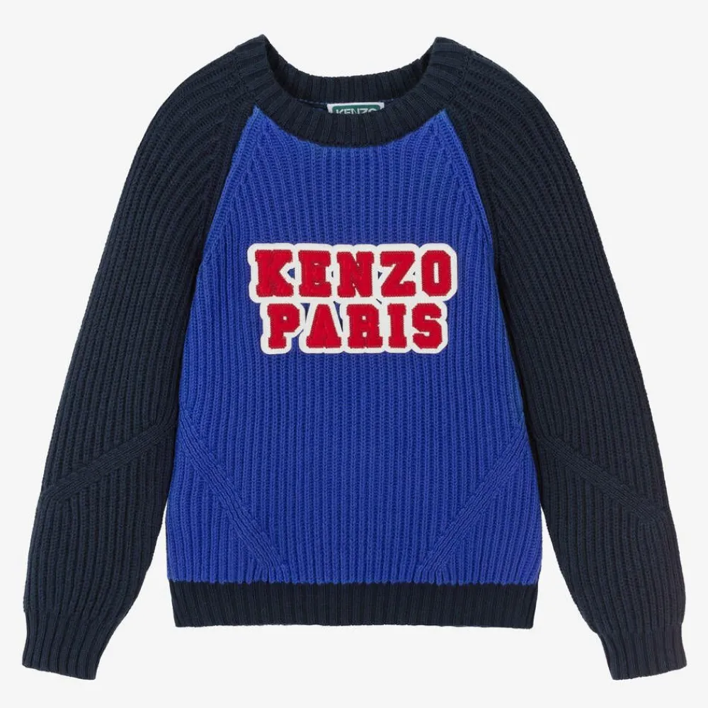 Cool and casual, this blue colourblock jumper for boys and girls is by KENZO KIDS. Knitted in a blend of cotton and wool, it has navy blue long sleeves that match the neckline and the hemline for a relaxed look. There is a red and white varsity-style logo patch stitched on the chest for a signature finish.