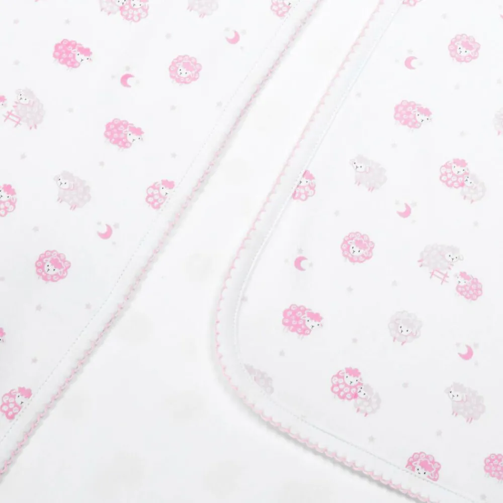 White blanket for baby girls by Kissy Kissy, made in a double layer of soft, stretchy Pima cotton jersey. One side has a cute pink sheep pattern with pretty pink picot trims. The reverse is plain white. This lovely accessory is ideal for use in the nursery or when out and about in the pram or car seat.