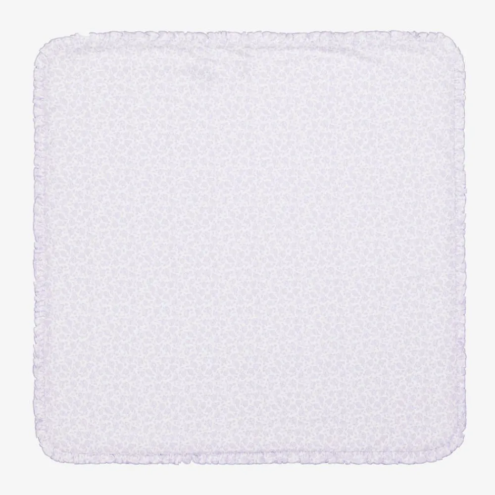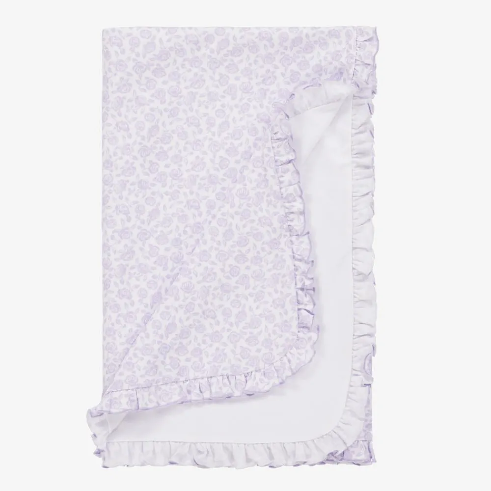 Sweet blanket for baby girls by Kissy Kissy, made in a double layer of soft and stretchy Pima cotton jersey. The front is patterned with a lilac purple floral design and has a pretty ruffle trim around the edges. The reverse is plain white. This lovely accessory is ideal for use in the nursery or when out and about in the pram or car seat.