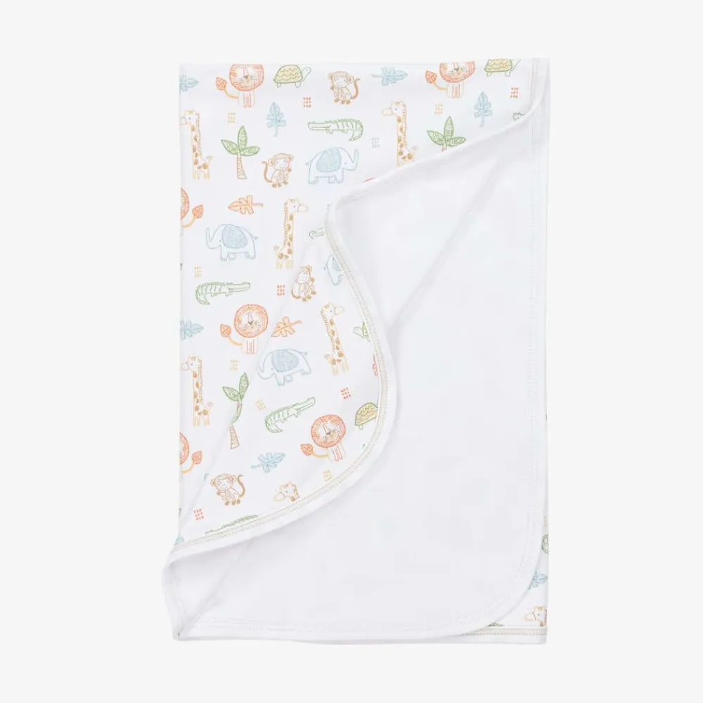 Super soft white Pima cotton blanket for baby boys by Kissy Kissy, with a colourful jungle animal print. Made in a double layer of super soft, comfortable jersey, it is ideal for the nursery or when out and about in the pram or car seat.