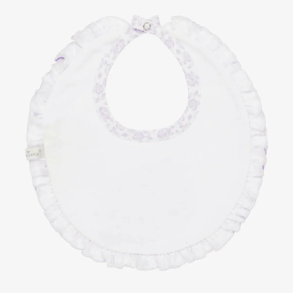 A pretty bib for baby girls by Kissy Kissy, patterned in lilac purple flowers on a white background. It is made in a double layer of super soft Pima cotton jersey, with frilled trims. It secures easily with a single popper behind the back.