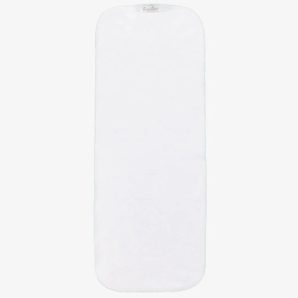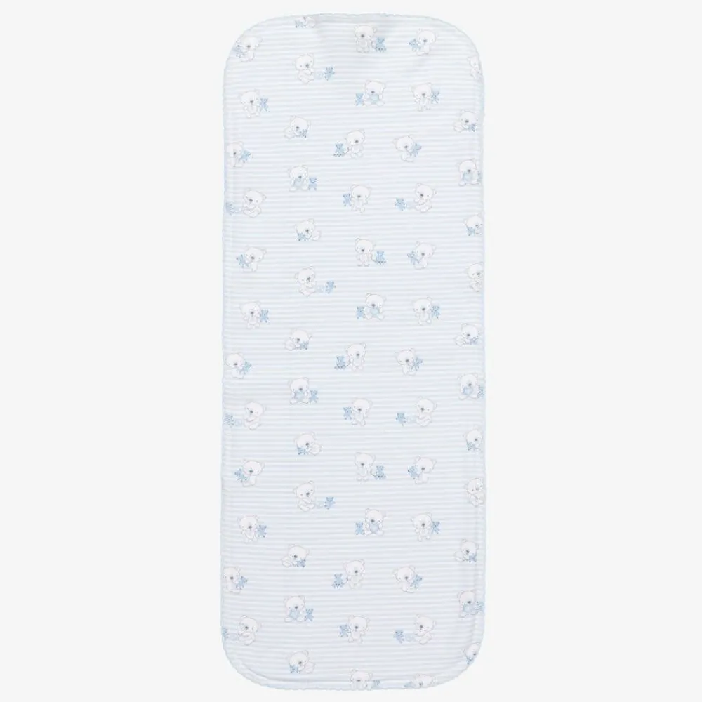Printed with a cute teddy bear pattern, this pale blue striped burp cloth for baby boys is by Kissy Kissy. Made from smooth Pima cotton with a neat picot trim, it has a soft towelling underside for extra absorbency. It can be used as a burping cloth or to mop up little spills.