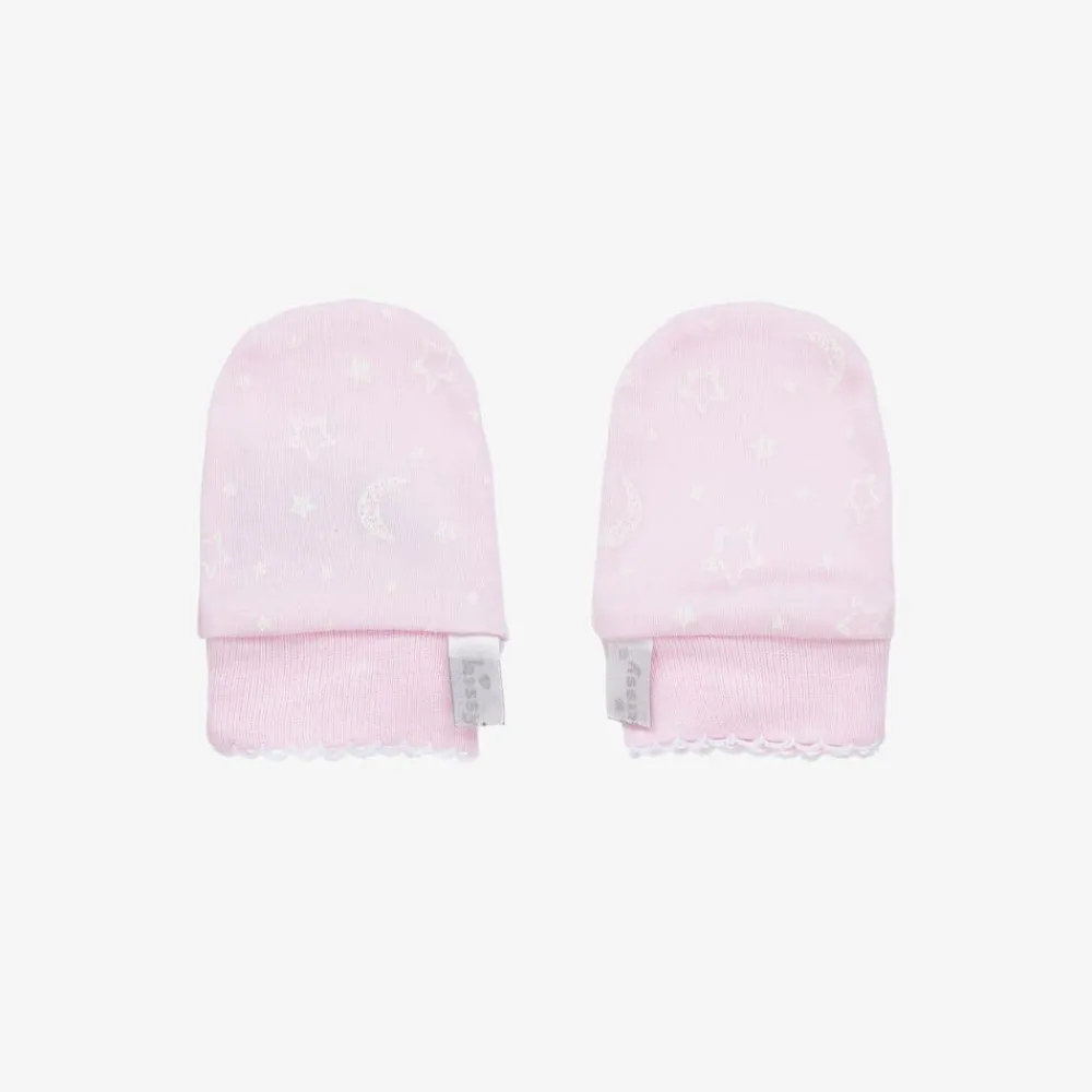 Lovely pale pink scratch mittens for baby girls by Kissy Kissy. They are printed with a charming white stars and moons pattern and have sweet picot trims on the finely ribbed cuffs. Comfortable to wear, they are made from soft Pima cotton jersey.