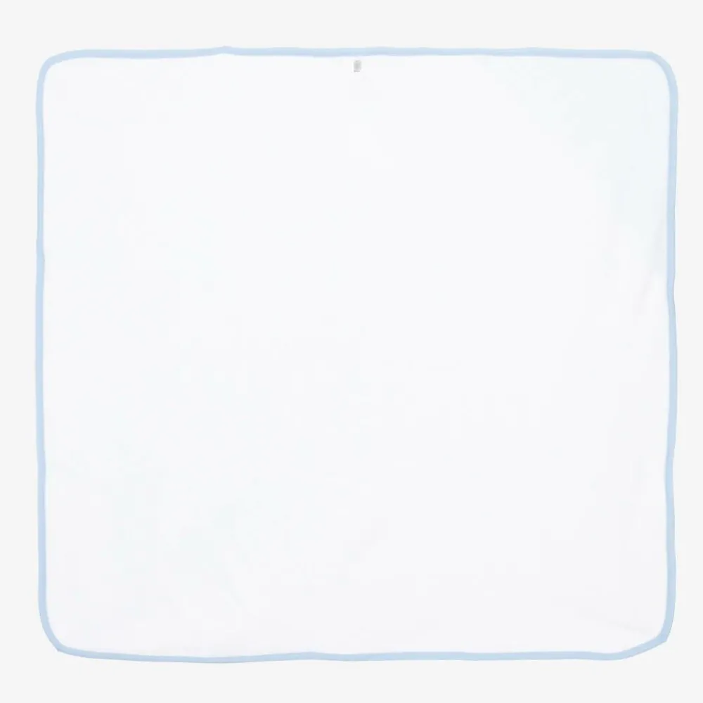 White cotton hooded towel and mitt set for baby boys by Kissy Kissy. Made in beautifully soft towelling, it has a pale blue Pima jersey hood with an embroidered bear face, and matching trims. Ideal for bath time, it comes with a soft mitt that has an elasticated cuff.