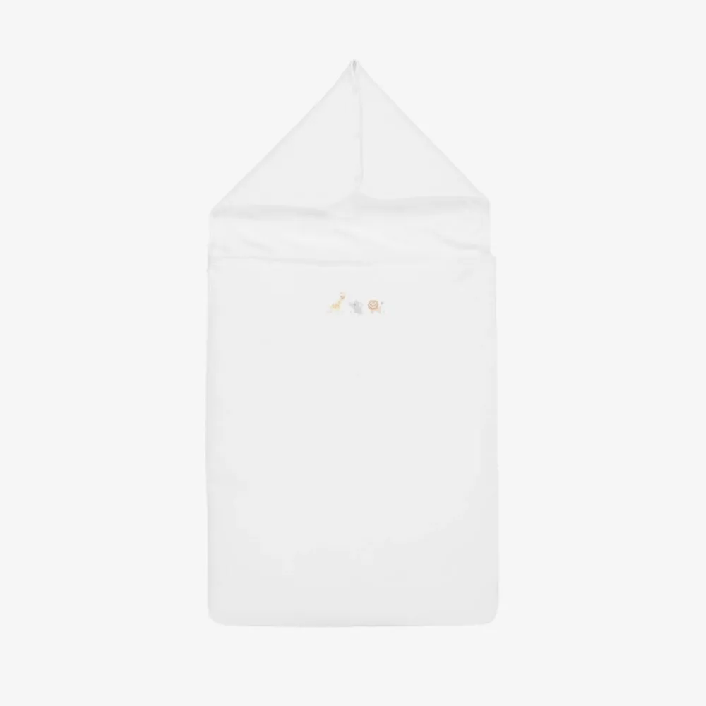 Exclusive to Childrensalon, this white baby nest for boys and girls is designed by Kissy Kissy. Made in soft Pima cotton, this jersey nest is delicately embroidered with friendly jungle animals. Poppers fasten on the hood and a practical side zip helps to get baby in and out with ease. Mid-weight padding ensures baby feels warm and comforted.