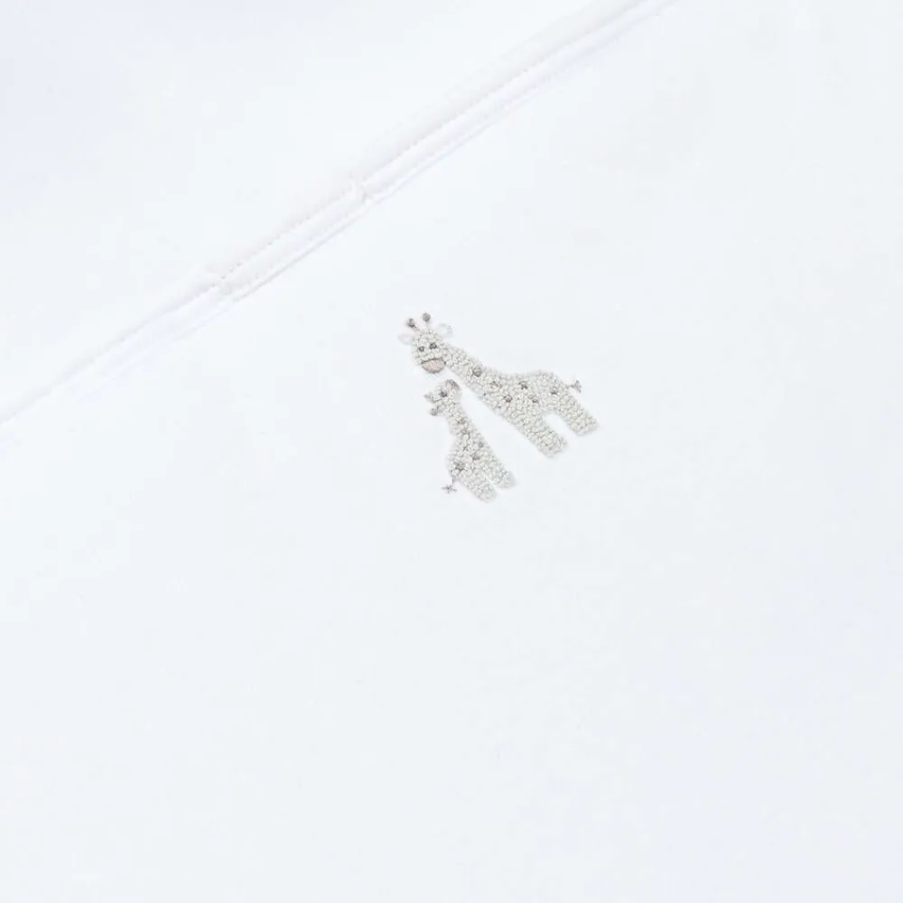 Exclusive to Childrensalon, a white nest for baby boys and girls by Kissy Kissy, made in super soft Pima cotton jersey. Lightly padded for warmth, this cosy nest has cute grey hand-embroidered giraffes on the front. It has a zip fastening on one side and the popper fastenings on the hood can be opened to lay it flat.