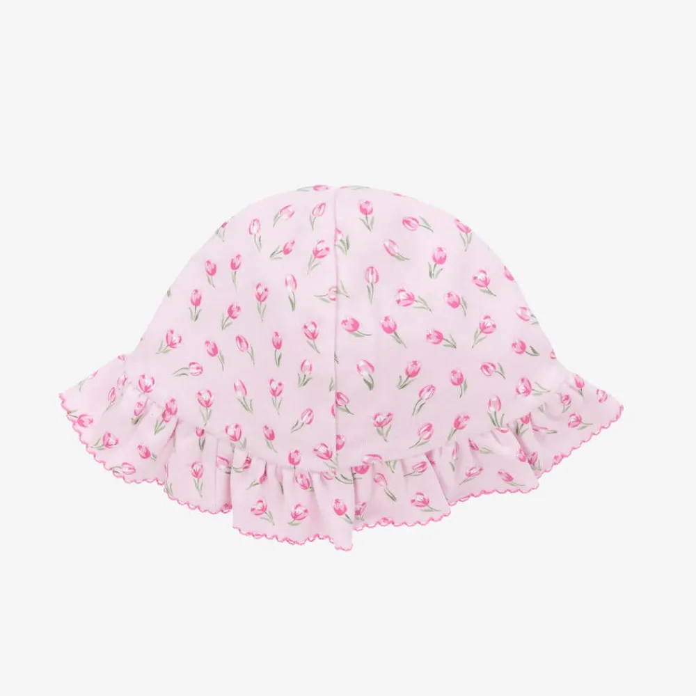 Pretty pink hat for baby girls from Kissy Kissy, made in super soft Pima cotton jersey. It has a sweet tulip pattern in shades of pink and green, and a ruffled brim with a delicate picot trim.