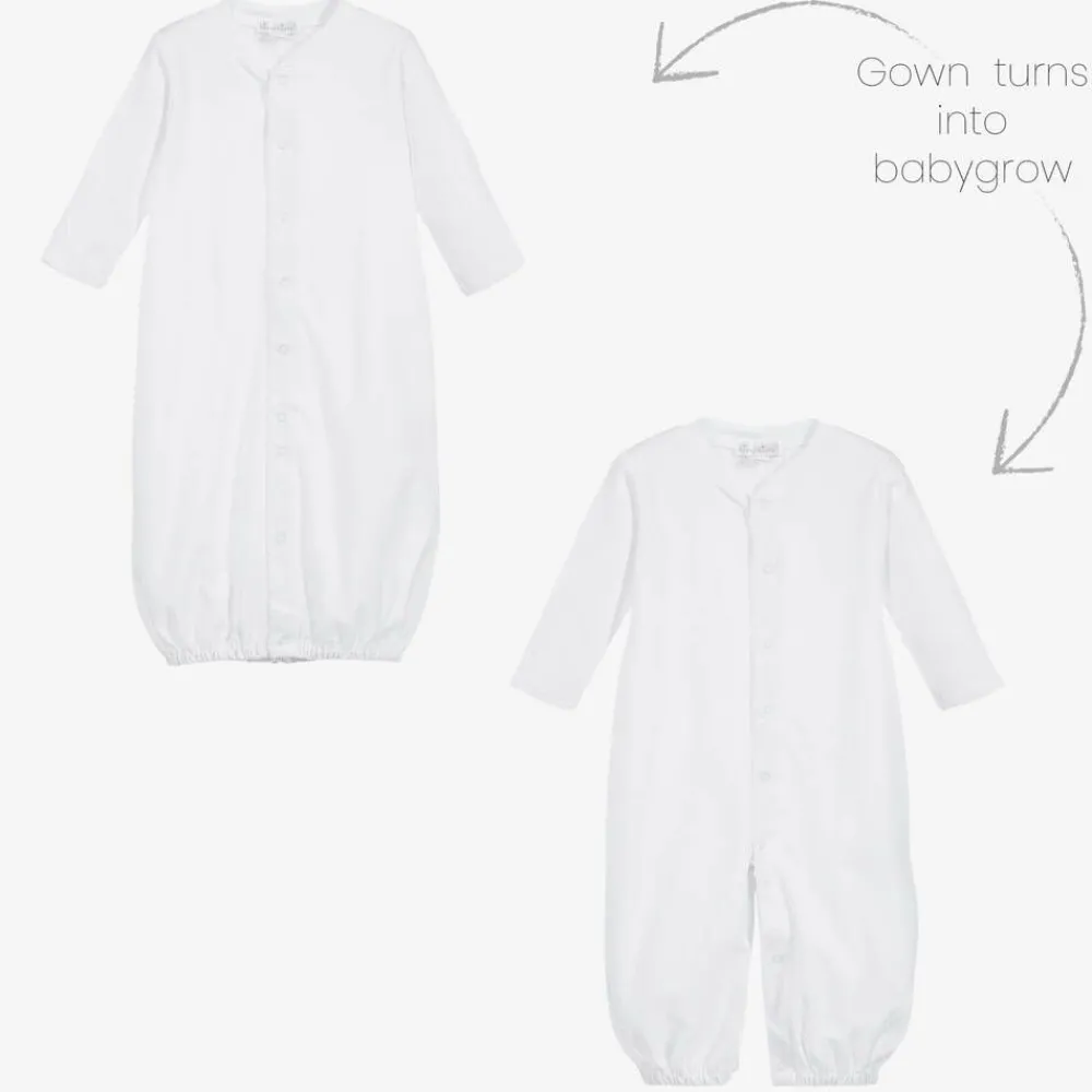 A white baby converter gown with scalloped trims for boys and girls by Kissy Kissy, made in the softest Pima cotton jersey. It has an elasticated hem and simply pulls up, and can be worn as a babygrow or as a gown.