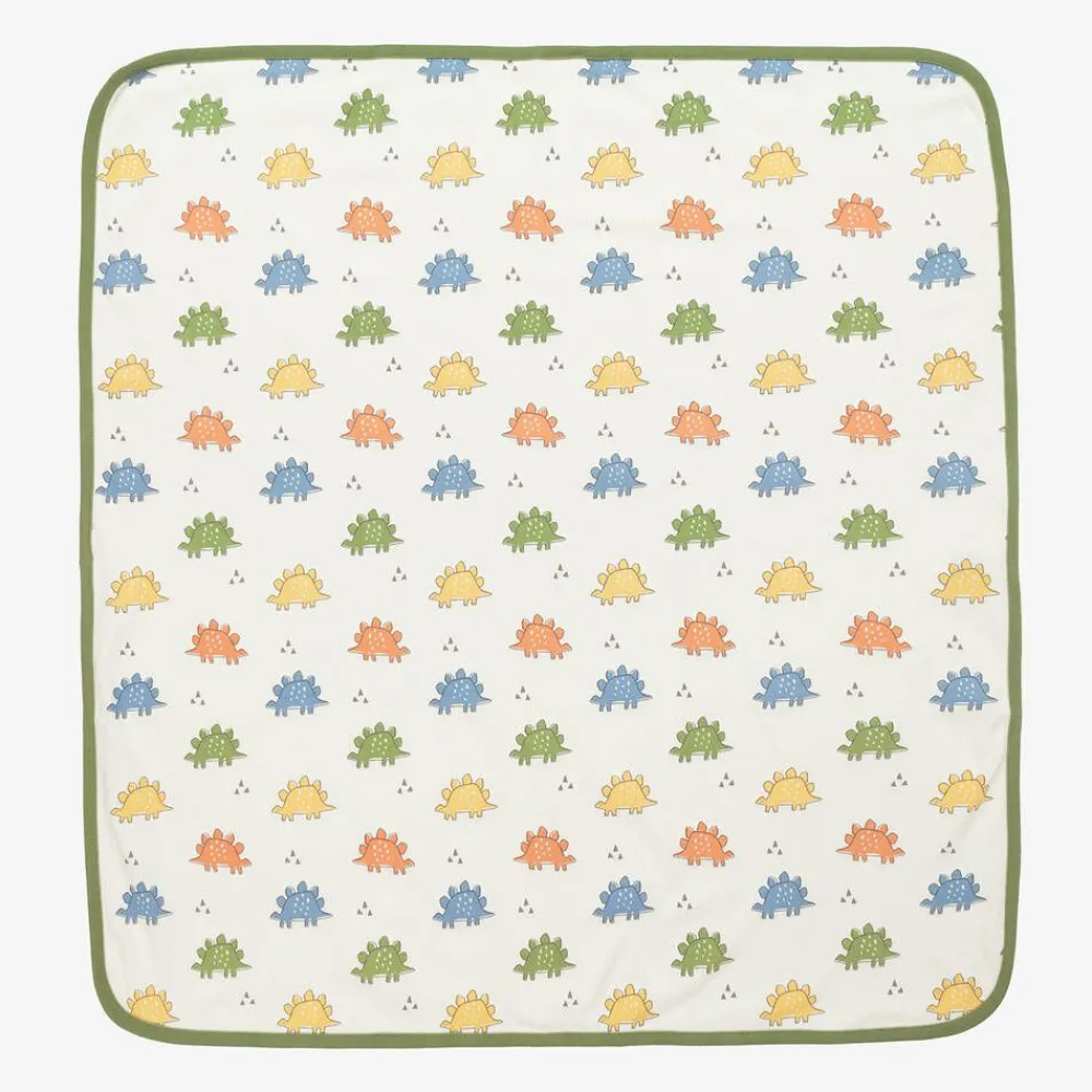 Super soft, this ivory blanket for baby boys by Kissy Love is made from lightweight Pima cotton jersey. Printed on one side with a fun dinosaur pattern in muted blue, green, orange, and yellow shades, it has a green ribbed border for a neat finish. Gentle on delicate skin, it is ideal for use in the nursery or when out and about in the pram or car seat.