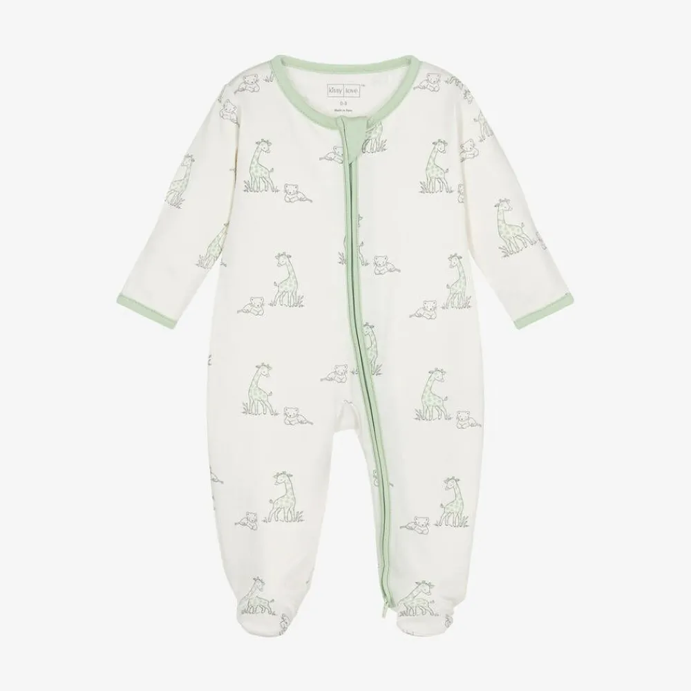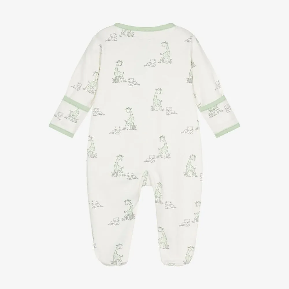 An ivory babygrow for boys and girls by Kissy Love, made from soft Pima cotton jersey. For an adorable look, it is printed with a cute giraffe and lion cub pattern, with light green trims. Fastening with a two-way zip on the front, it has a protective chin guard and fold over scratch mitts on smaller sizes.
