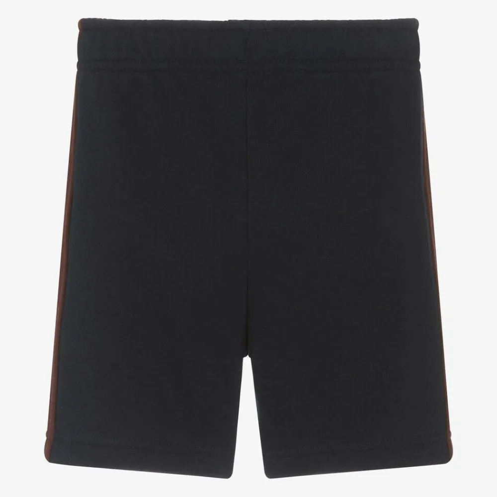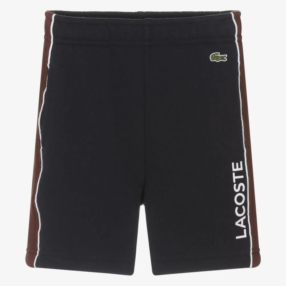 Casual navy blue shorts for boys by Lacoste, made in comfortable organic cotton-blend jersey. Burgundy red side trim with white piping detail adds a sporty look, and they have neat, side seam pockets. The stretchy waistband has an internal drawstring tie for an adjustable fit. Completing the design with a branded touch, the signature crocodile patch can be seen on the hip and there is a bold white logo print on one leg.