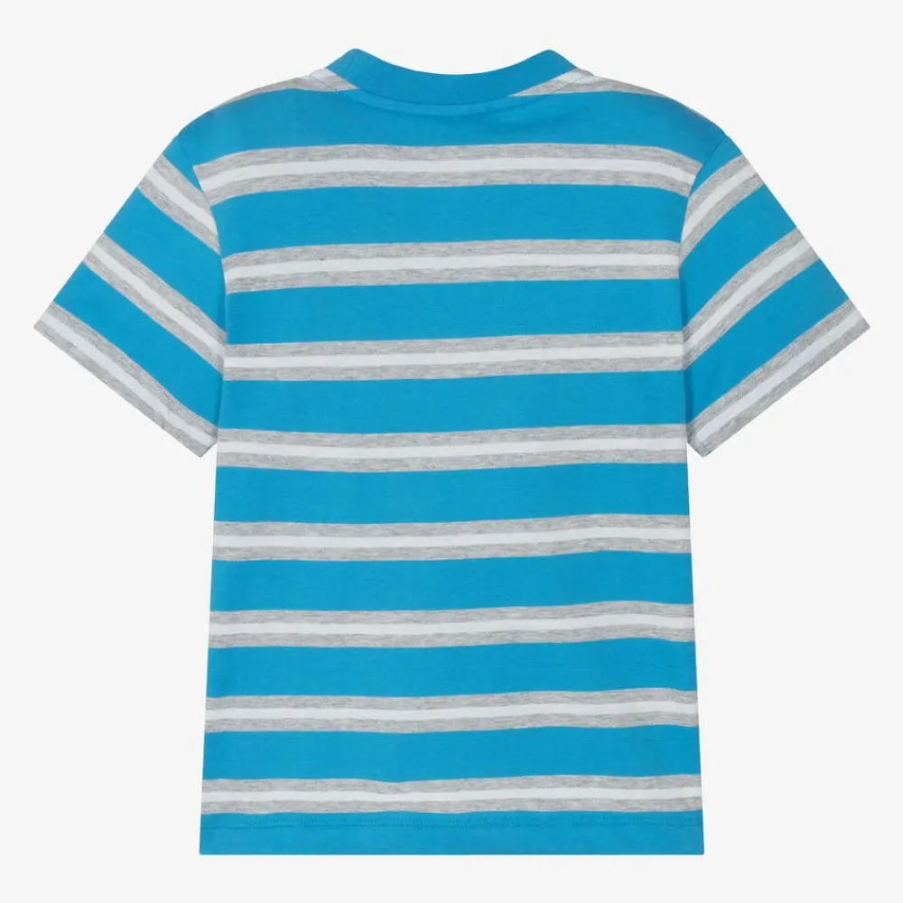 Blue organic cotton T-shirt for boys and girls by Lacoste, with grey and white stripes. Made in soft and comfortable jersey, this short-sleeved tee has a ribbed crew neckline. The iconic crocodile logo patch can be seen on the chest for instant designer appeal.