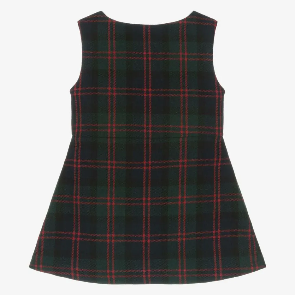 Smart navy blue, green and red tartan dress for girls by Lapin House, made in a soft wool blend. Ideal for layering, this stylish, sleeveless design has a flared skirt with inverted pleats on the front. It is fully lined in lightweight cotton and fastens with an exposed gold zip on the front for an elegant finish.