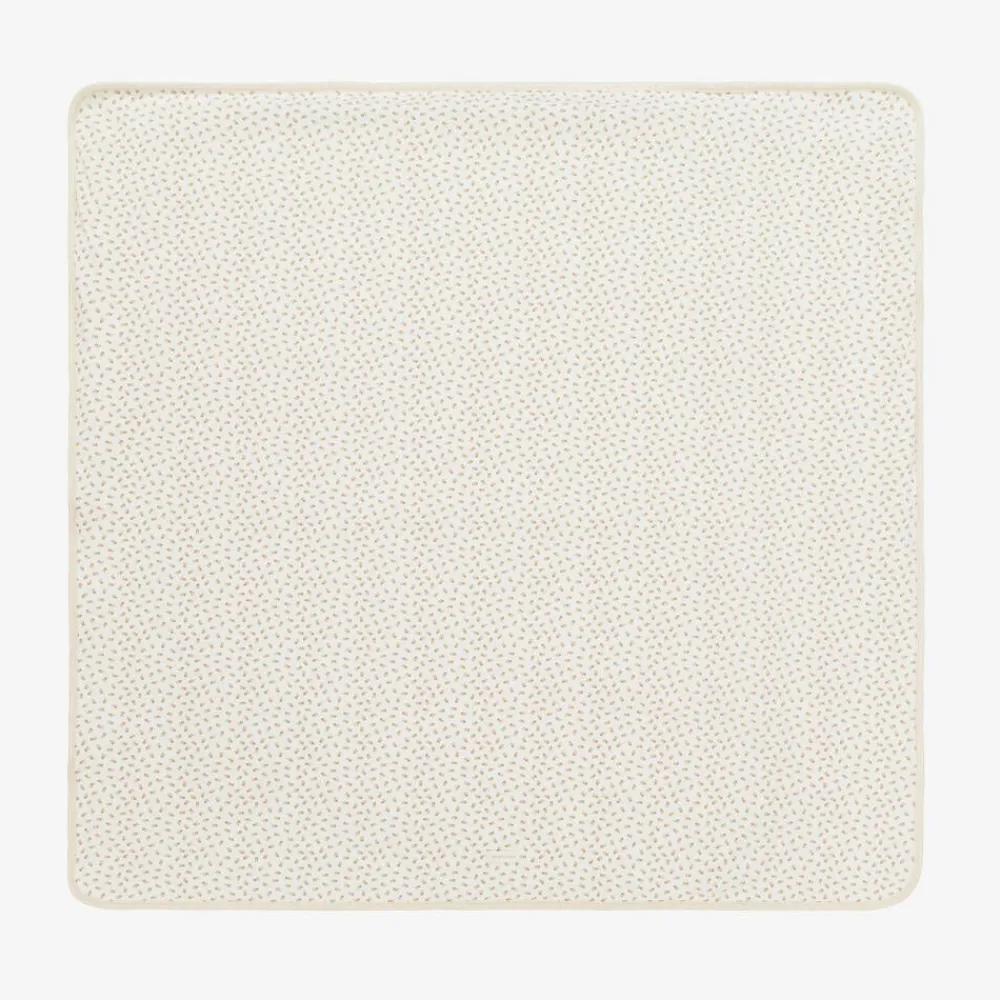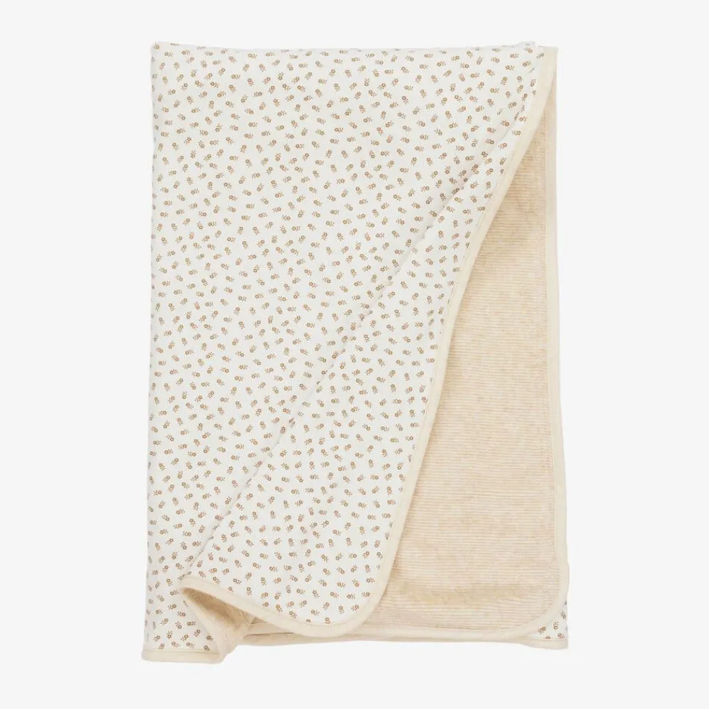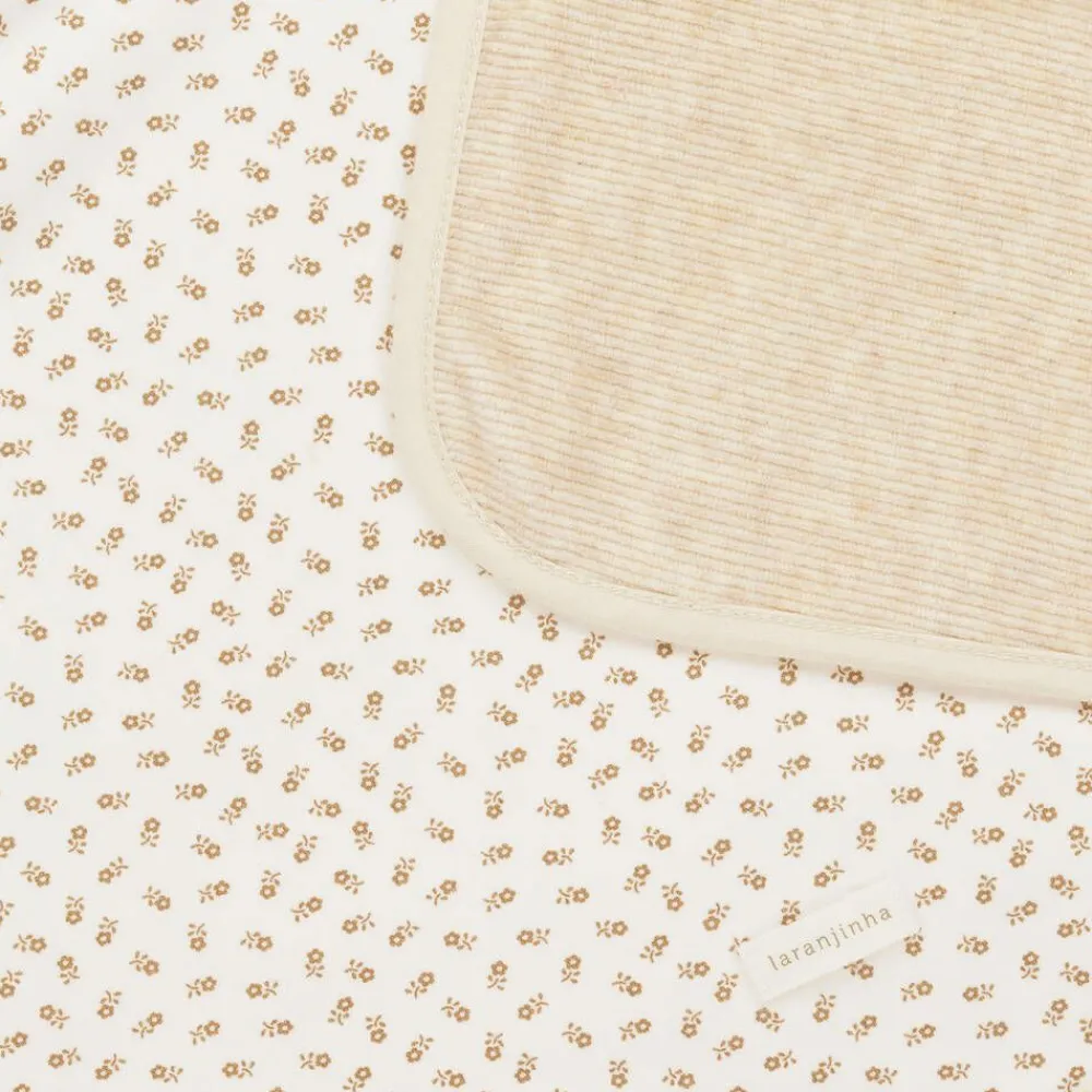 Ivory organic cotton blanket for girls by Portuguese brand Laranjinha, with a sweet, stylised floral print in beige. Made in soft, stretchy jersey, it is trimmed in beige, with a coordinating, ribbed velour lining. It is ideal for both the nursery and for when out and about in the pram or car.