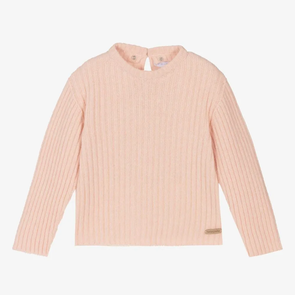 Pink ribbed sweater for girls by Portuguese brand Laranjinha. Warm and cosy, it is knitted in a soft wool, cashmere and viscose blend and has a detachable, floral ruffle collar, secured with poppers. There is a simple keyhole button fastening on the back of the neck.
