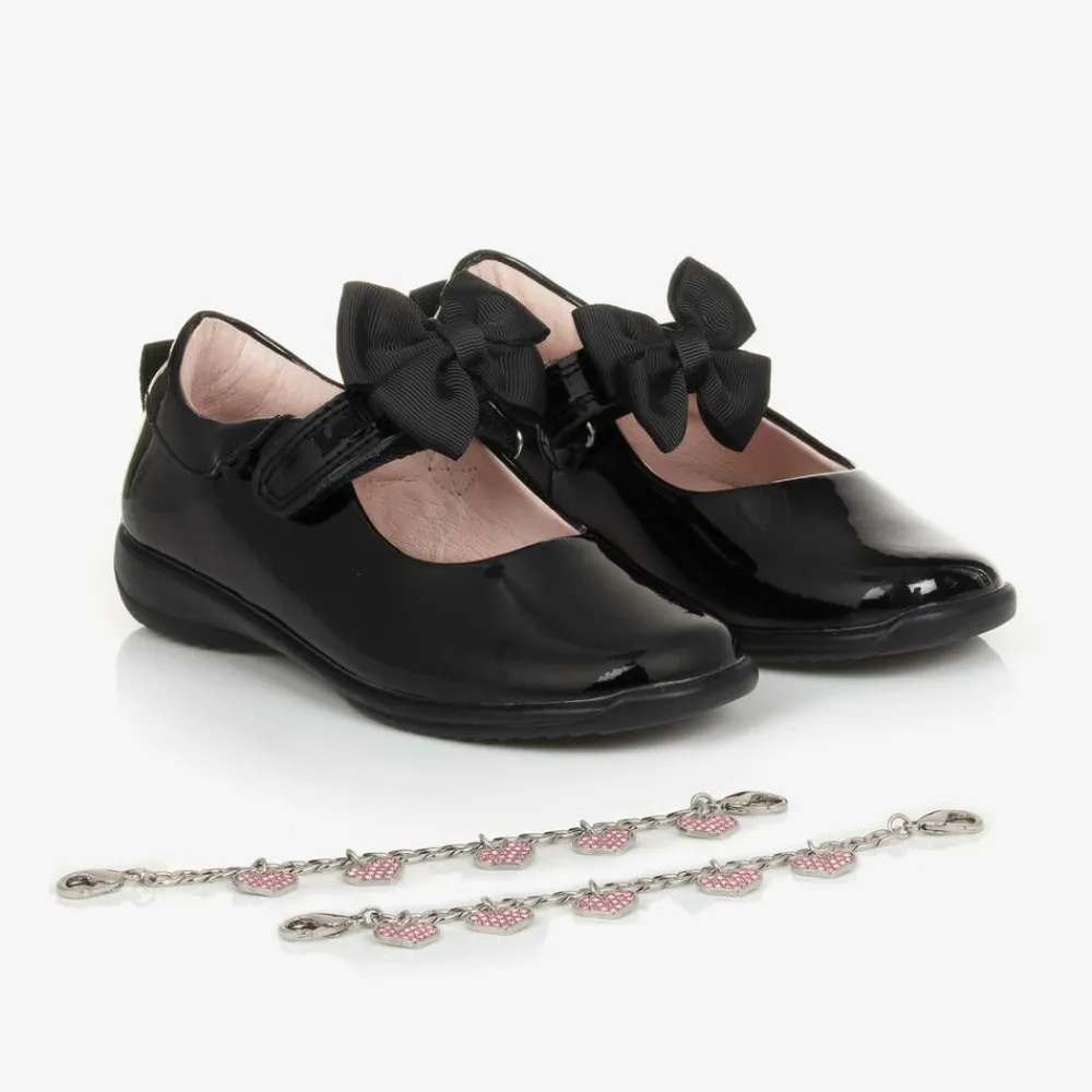 Smart black shoes for girls by Lelli Kelly, made in glossy patent leather. Ideal for school and formal occasions, these comfortable shoes are lined in soft and supple pink leather with padding around the ankle and a lightly cushioned insole. The velcro fastening strap has a removable grosgrain ribbon bow and can be adjusted for a good fit. Adding fun and versatile styling options, each shoe comes with a removable silver metal bracelet with sparkly pink diamanté hearts. A flexible, non-slip rubber sole adds a practical finish