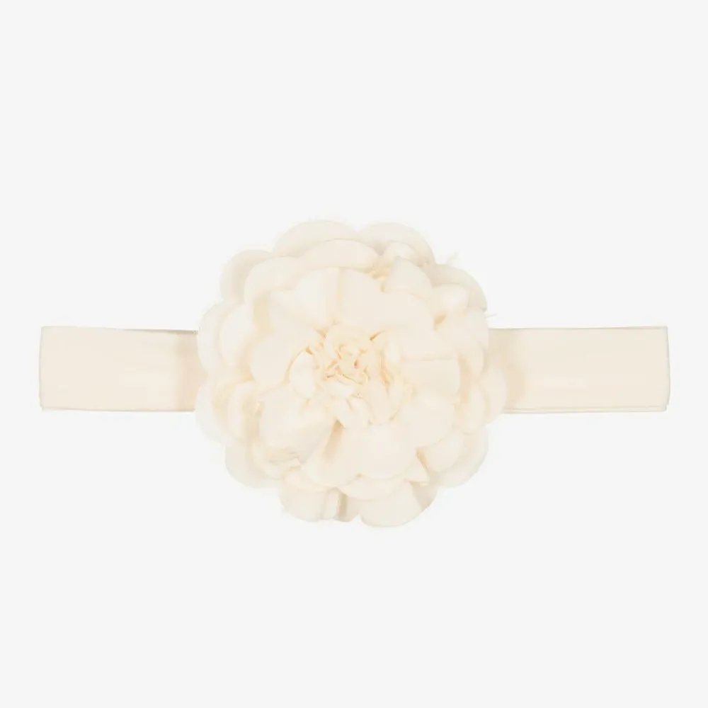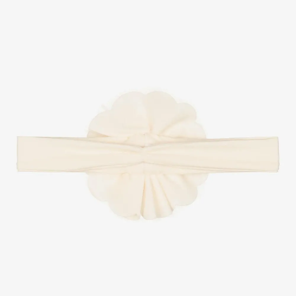 Sweet ivory headband for baby girls by Lemon Loves Layette, made in super soft Pima cotton jersey. It has a ruffled lily pad flower in the centre, with layers of tulle petals giving a pretty finish.