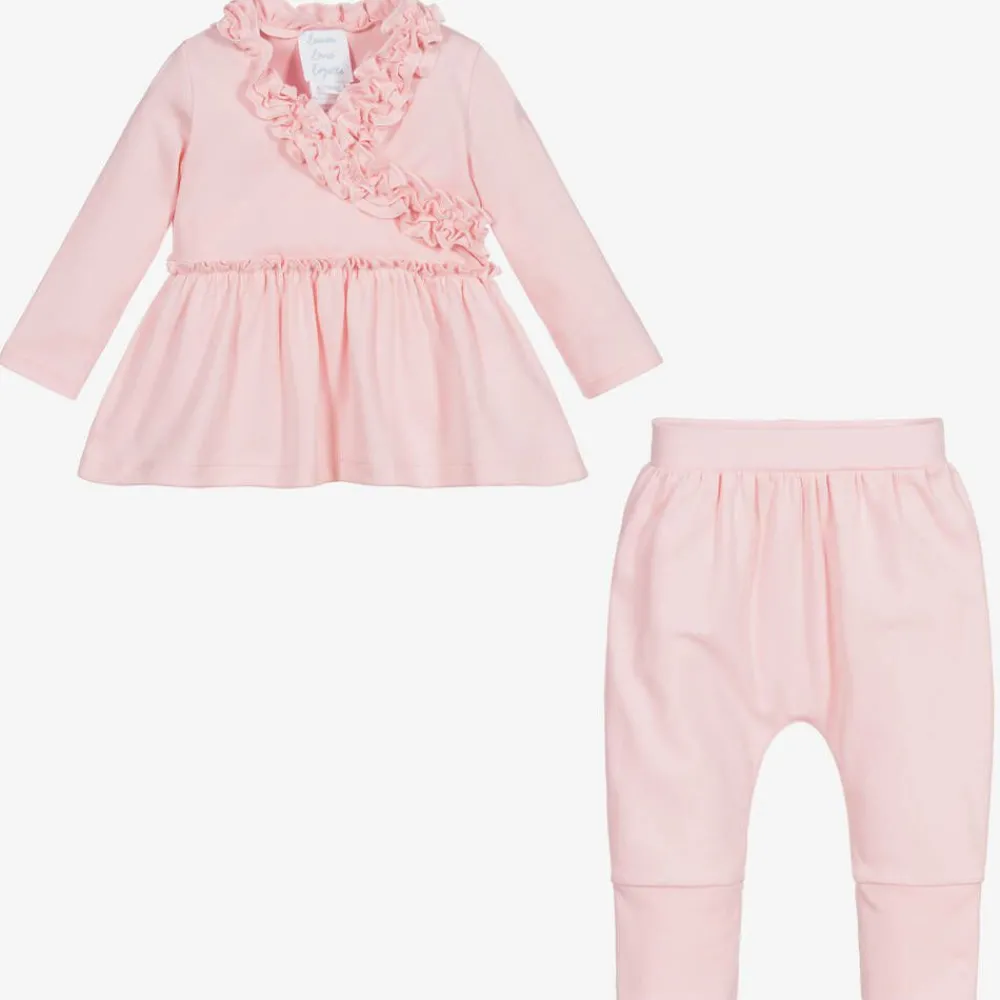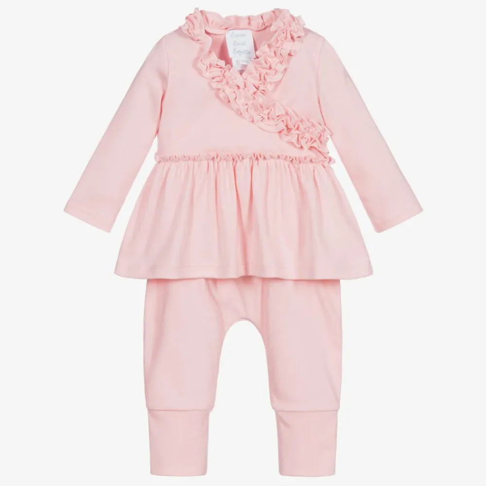 Pale pink trouser set for baby girls by Lemon Loves Layette, made in super soft and comfortable Pima cotton. The long-sleeved top slips on easily over the head, has a pretty ruffle on the cross-over bodice and a frilled hem. The matching trousers have gently elasticated cuffs and waistband for a comfortable fit.