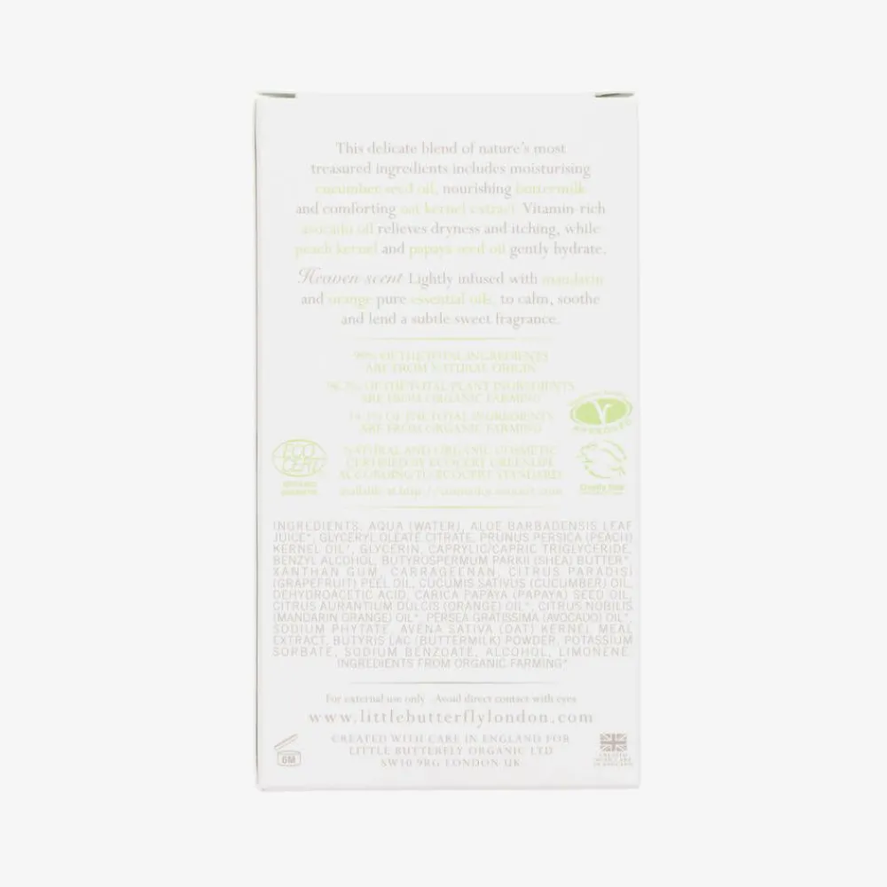 'Floating on Clouds' bath milk for younger boys and girls by Little Butterfly London, suitable for use from birth. Relaxing and nourishing, this certified organic bath milk is made with calming and comforting ingredients, gentle enough for very sensitive, dry and eczema-prone skin. It contains moisturising cucumber seed oil, nourishing oat kernel extract and buttermilk. Hypoallergenic and dermatologist approved, this UK-made bath product creates a calming, subtly fragranced aroma when poured under warm water, thanks to orange and mandarin essential oils. Avocado and papaya seed oils help to soothe dry, itchy skin.