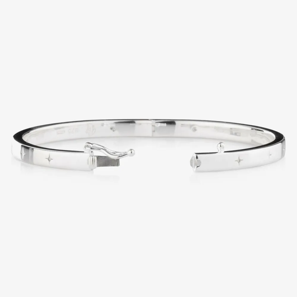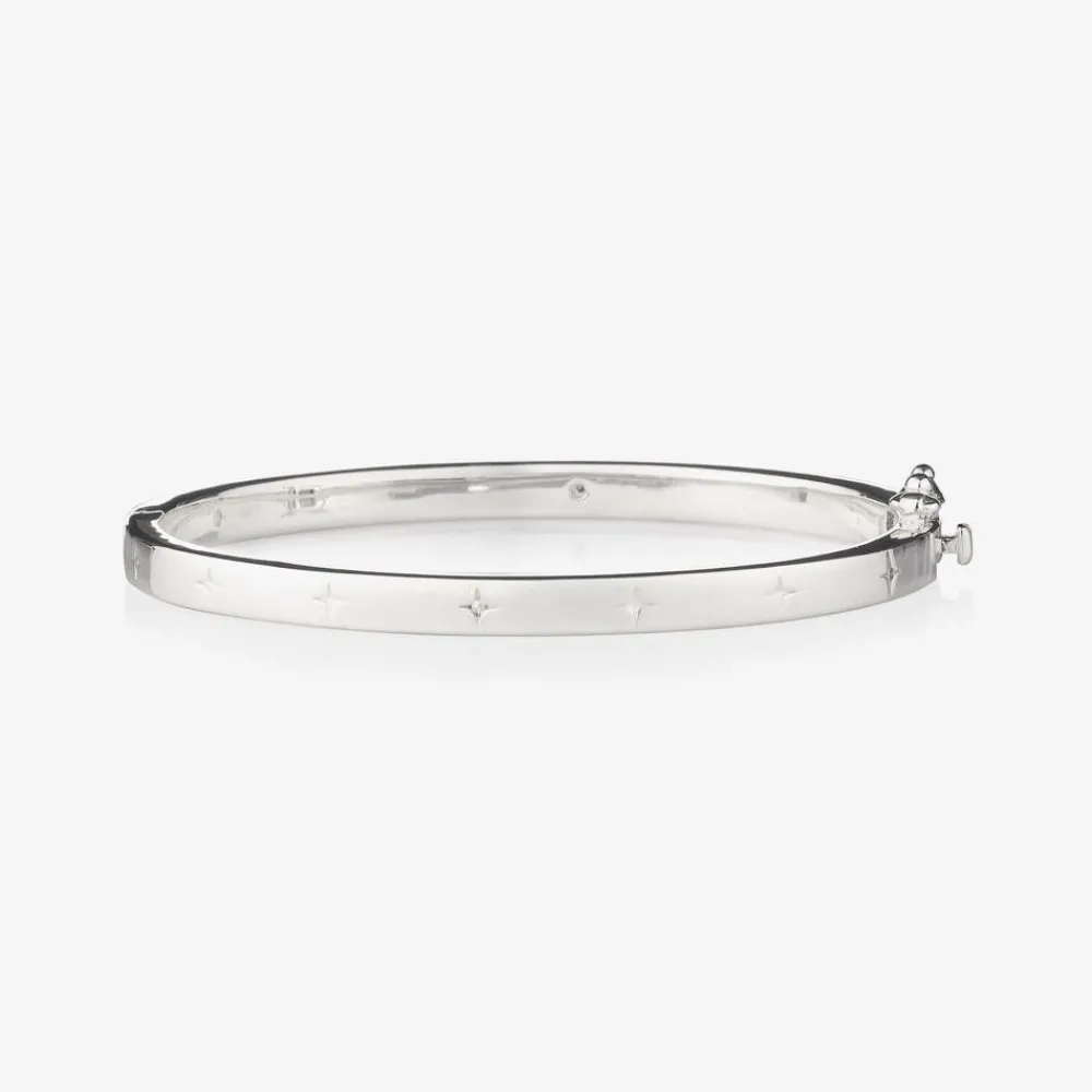 A beautiful bangle for boys and girls by British designer Little Star, made in sterling silver. Delicate and timeless, this elegant design features six luxurious diamonds set on dainty star-engravings. Its hinge-clasp fastening ensures ease of dressing. A wonderful present option, the bangle comes with a fabric pouch, box and gift bag.