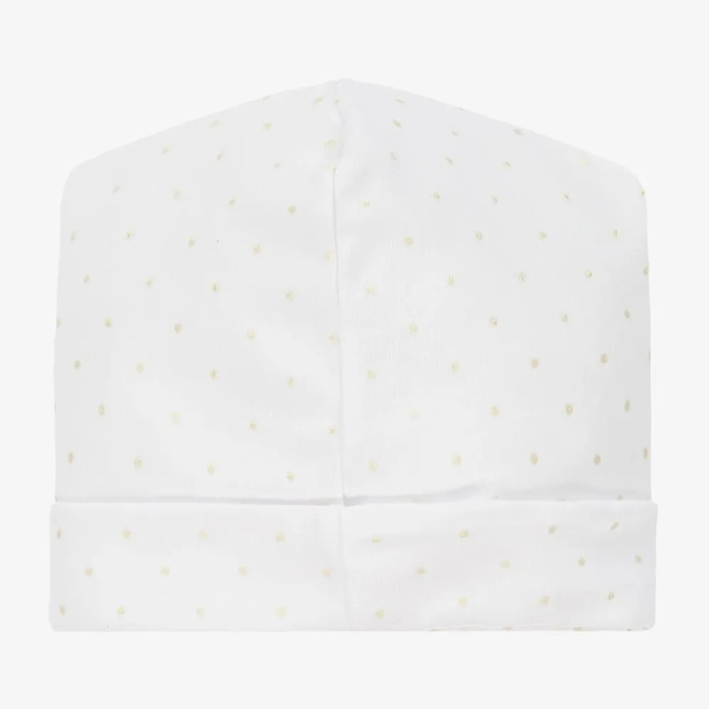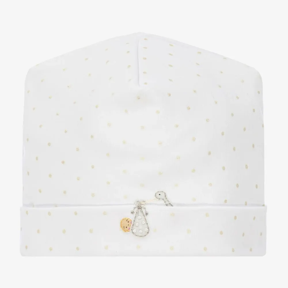 Baby girls and boys white super soft Pima cotton hat by Magnolia Baby. Made with a double layer of jersey, it has an ivory dotty print and a cute stork applique on the front.