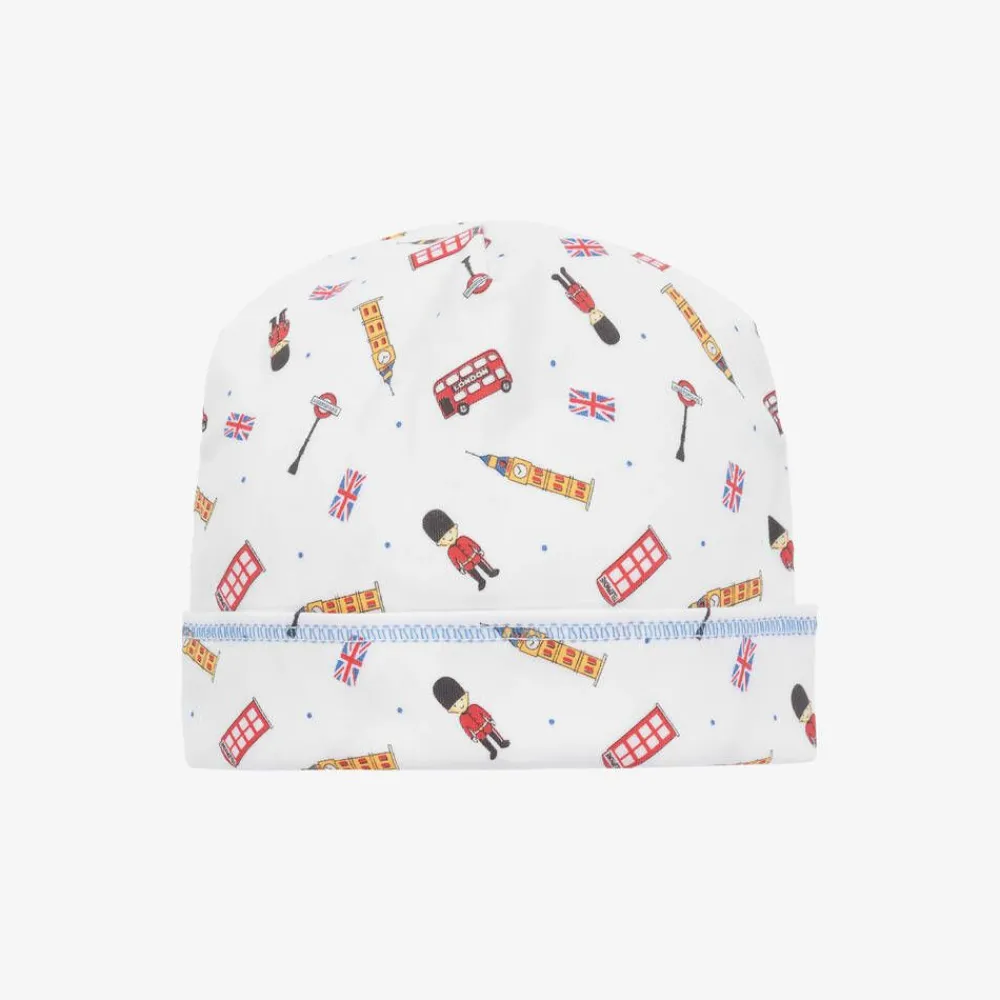 Lovely white hat for baby boys and girls from Magnolia Baby. Made in a double layer of soft Pima cotton jersey, it has an iconic London-themed print and a turned-up brim.