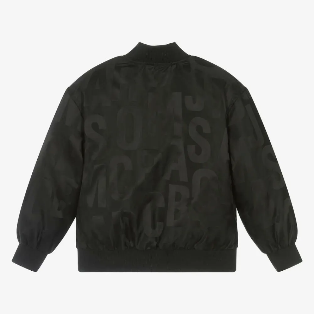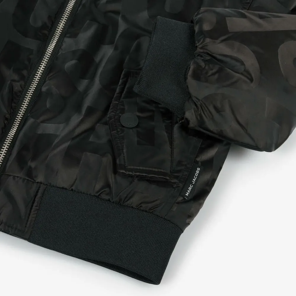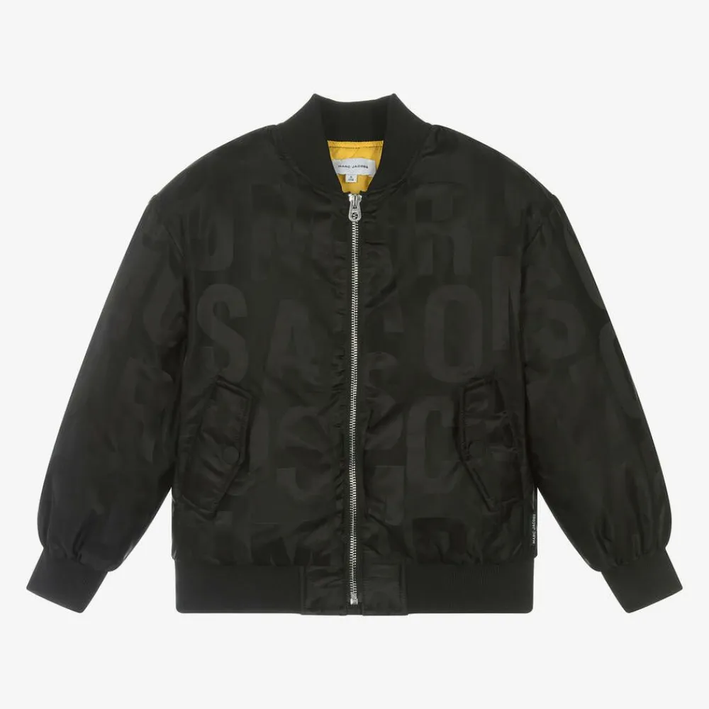 Stylish black satin bomber jacket for boys and girls by MARC JACOBS, as seen in the main collection. Made with recycled materials, it is woven with the American brand's jumbled logo in a tonal pattern for instant designer appeal. It is padded for warmth, with a bold yellow satin lining and has a zip fastening with a branded pull. Completing the designer look, it has soft ribbed trim on the collar, cuffs and hem and practical popper-fastening pockets with a cosy fleece lining. A woven logo tab on the side seam adds a signature finishing touch.