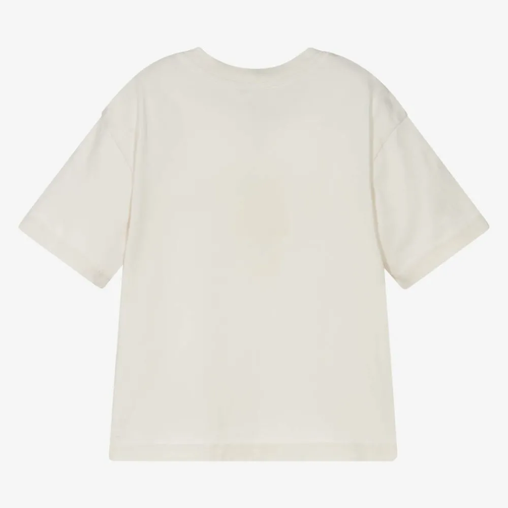 Light beige T-shirt for boys and girls by MARC JACOBS, made in soft organic cotton jersey. Casual and comfortable, this cool top has raw edges on the seams and a black smudged logo on the front for a statement designer finish.