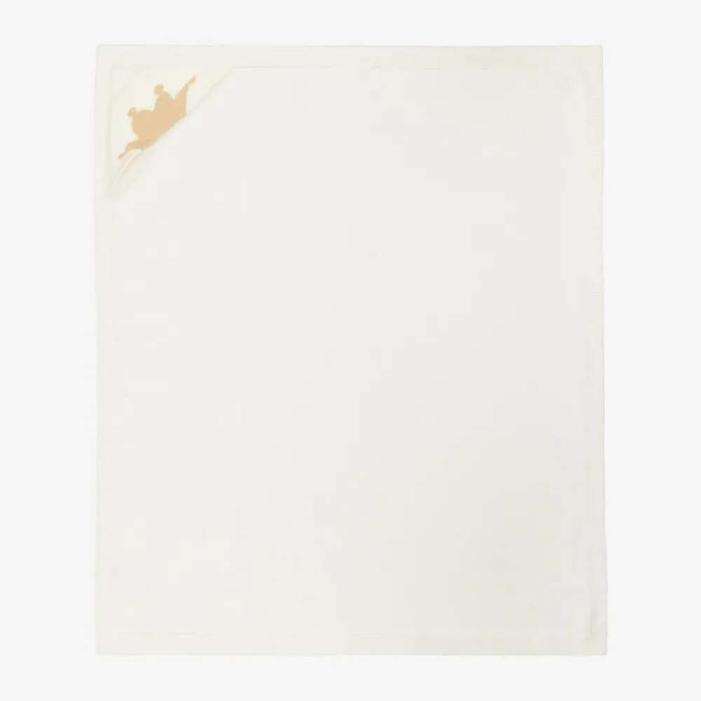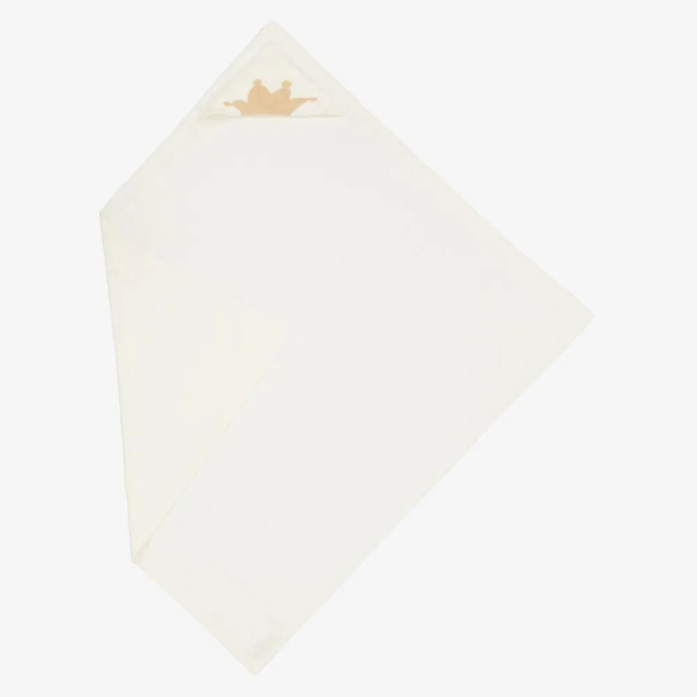 Ivory blanket for baby boys and girls by Marie-Chantal, with the designer's signature Tino Crown motif on the hood. Knitted in a luxuriously soft cotton and cashmere blend, this lovely blanket is ideal for wrapping baby and keeping them cosy and warm.