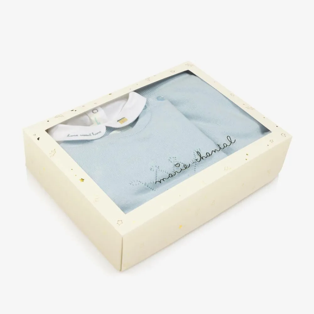 Lovely pale blue knitted trouser gift set for baby boys designed by the Greek princess Marie-Chantal. It is made in a luxuriously soft cotton and cashmere blend with cosy ribbed trims. The sweater has a cutwork crown on the front, with a shiny gold logo embroidered by the hemline and fastens with useful logo buttons on one shoulder. The trousers have a matching crown and star on the knees and a faux drawstring on the elasticated waistband, just right for little tummies. They come with a super soft Pima cotton jersey bodysuit, with a poplin Peter Pan collar that is beautifully embroidered with 'Home Sweet Home' and a little house in yellow and blue.