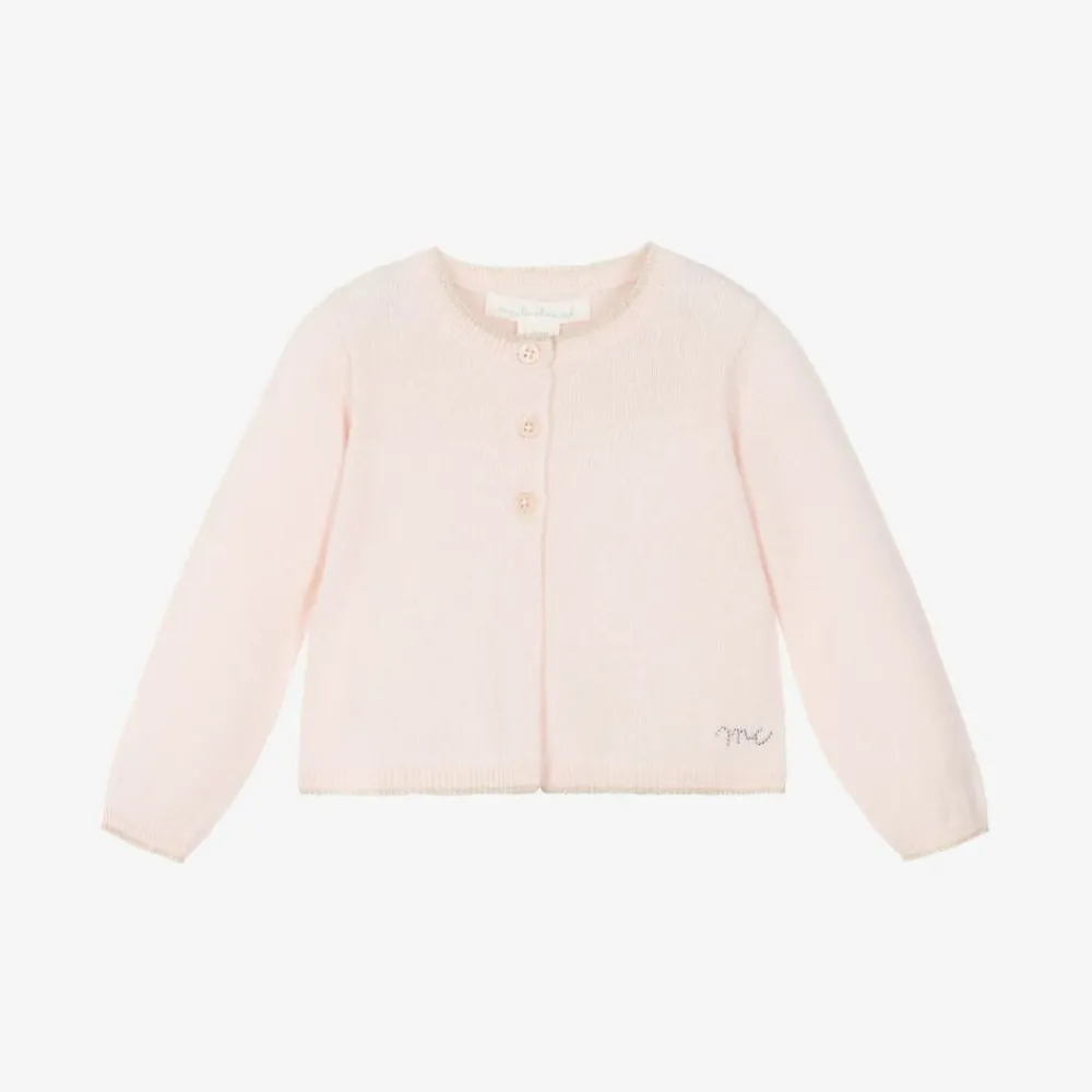 Lovely pale pink cardigan for baby boys and girls by Marie-Chantal, made in the softest cashmere. Cosy and luxurious, it has glittery gold edging on the ribbed trims and fastens with branded buttons on the front. The back features the brand's signature Angel Wing and there is a sparkly diamanté logo on the front.