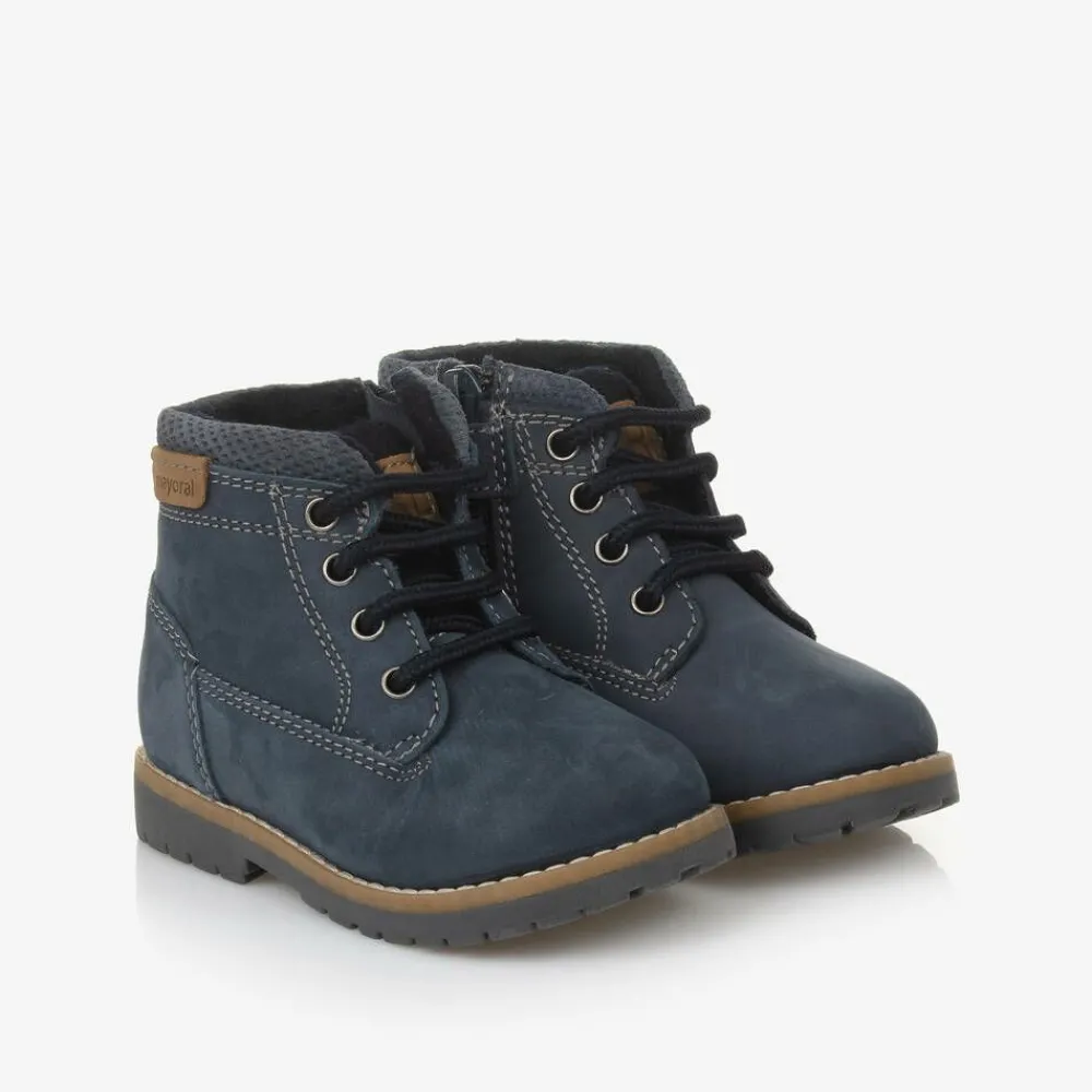 Sturdy navy blue leather boots for little boys by Spanish brand Mayoral, fastening with laces on top and a zip on the sides with a velcro strap. They have a cosy wool lining, with a cushioned leather insole for comfort and a rugged, non-slip tread on the rubber soles.
