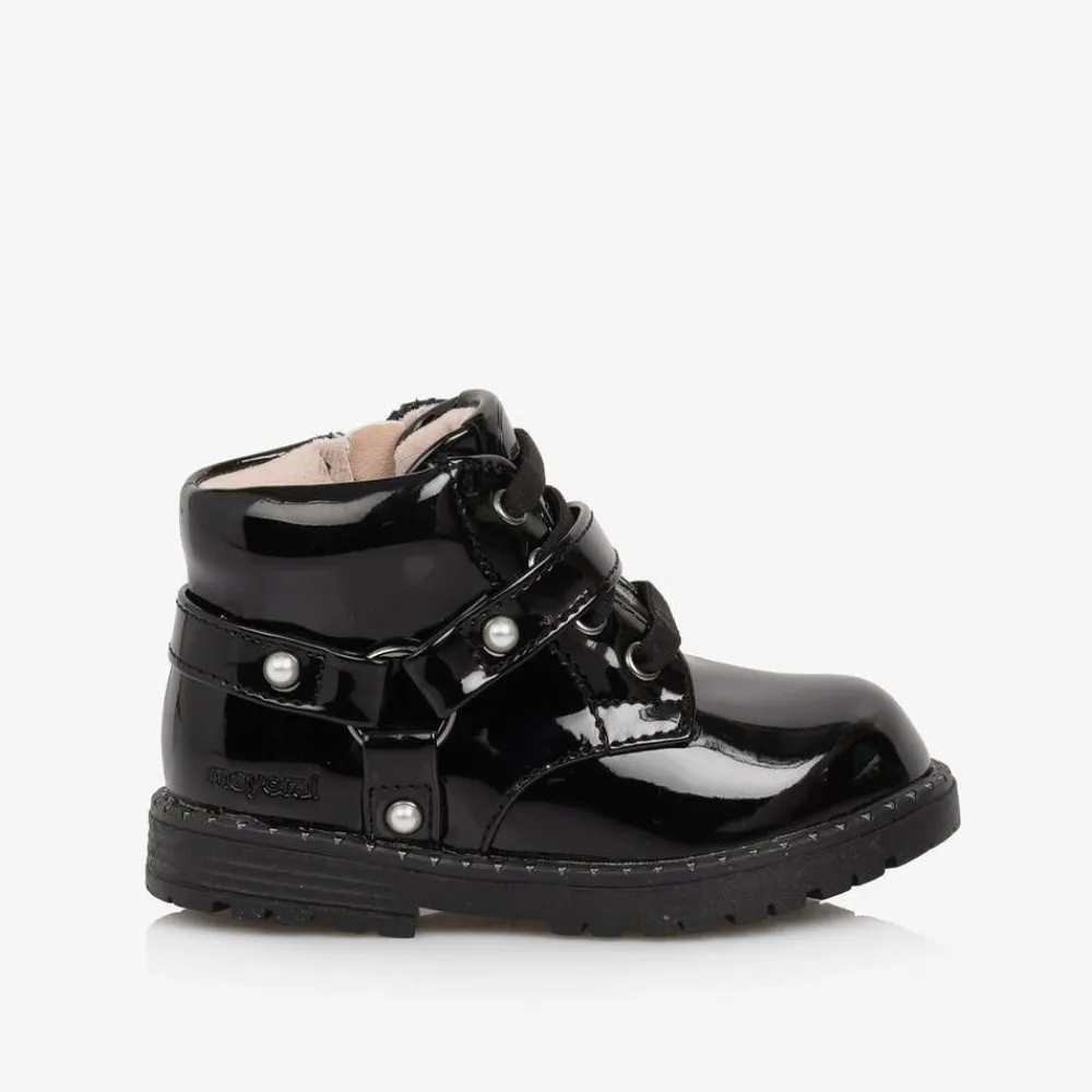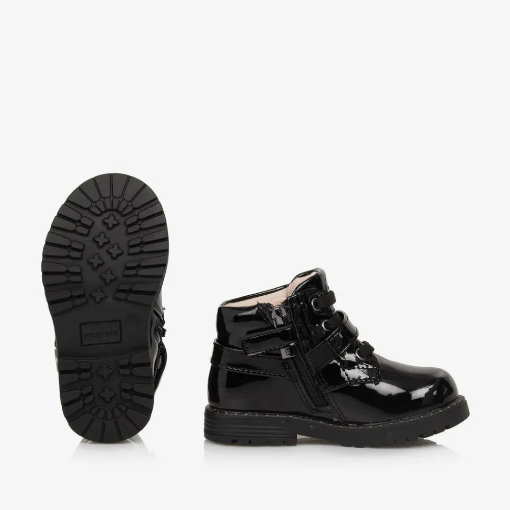 Glossy black boots for little girls by Mayoral, made in smooth, patent faux leather. This stylish design has decorative straps and a chunky, rubber outer sole detailed with tiny gold studs. They are lined in soft cotton corduroy and have a lightly cushioned insole for comfort. The side zip fastening is secured with a velcro tab and the elasticated laces ensure they slip on easily.