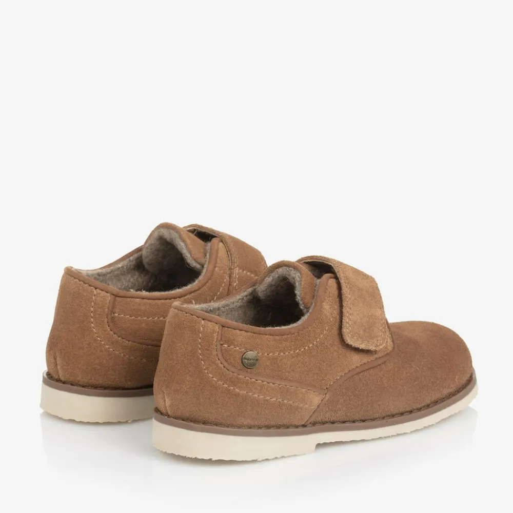 Smart brown shoes for baby boys by Mayoral, made in soft suede leather. They are comfortably lined in supple leather, with a cushioned leather insole and non-slip crêpe sole. The shoes fasten with a velcro strap across the foot.