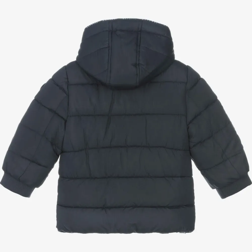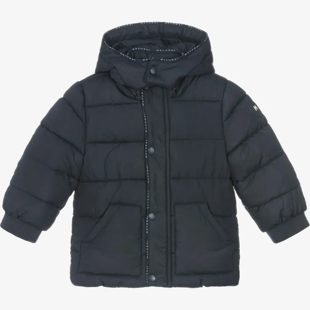 A navy blue puffer coat for little boys by Mayoral, made in a smooth matte fabric with a soft polar fleece lining. Fastening at the front with a zip and poppers, this functional coat has a detachable hood that zips on and off easily. It has front pockets with ribbed trims on the sleeves and interior hem to keep them warm. A rubberised logo is featured on one sleeve and there are navy blue branded edges on the hood and front.