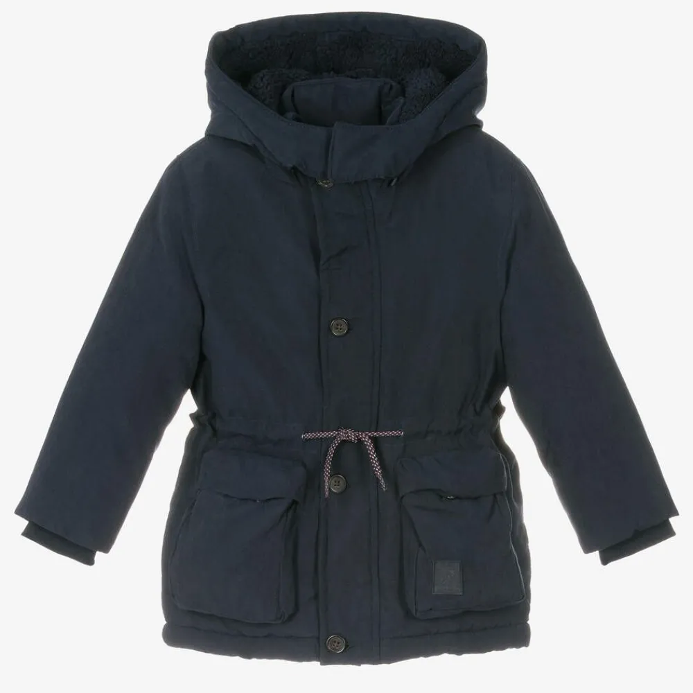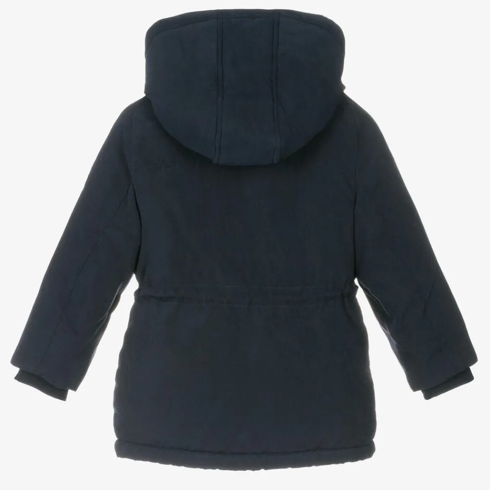 Navy blue parka coat for little boys by Mayoral, made in a super soft fabric with lightweight padding. It has zip and button fastenings on the front, and popper-fastening pockets. The adjustable drawstring waist, ribbed cuffs and cosy fleece lining offer warmth and practicality. The detachable hood fastens onto the coat with a zip and has a popper fastening at the front. 'Cosmic Friends' is embroidered in tonal thread on one sleeve and there is a rubberised logo on the pocket.