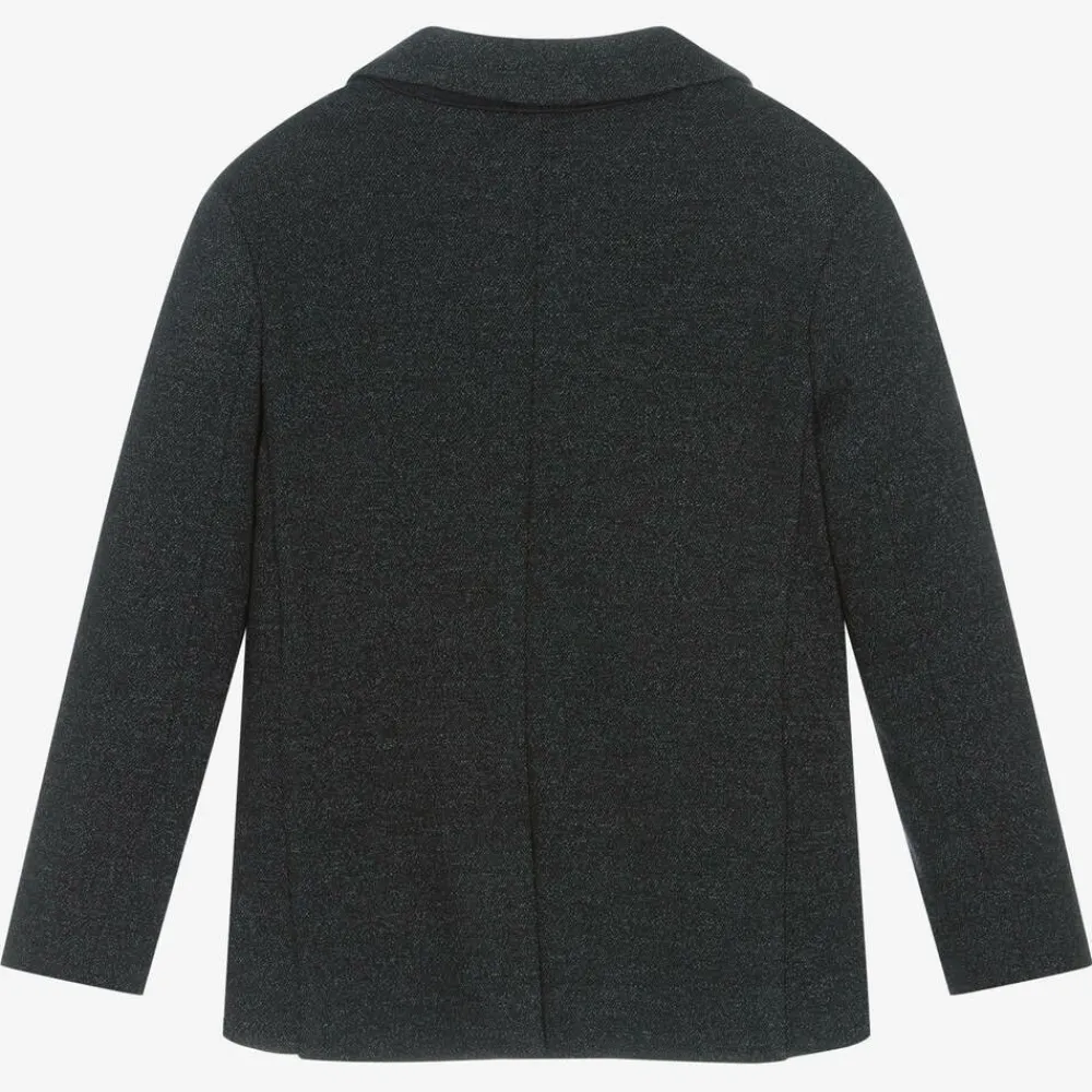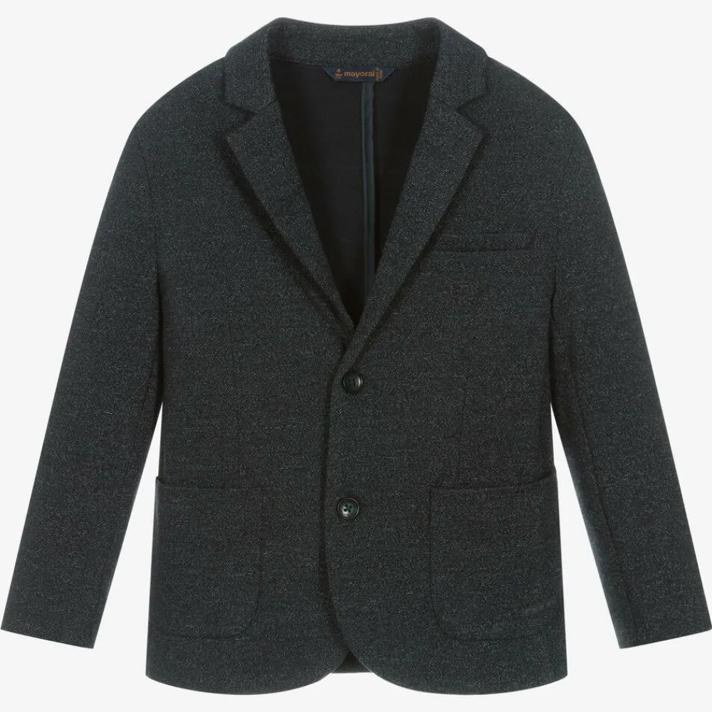 Smart navy blue blazer for boys by Mayoral, made in soft cotton blend jersey for comfort. For a classic look, it has lapels and front pockets. It fastens with simple buttons on the front, discreetly embossed with the brand's logo.