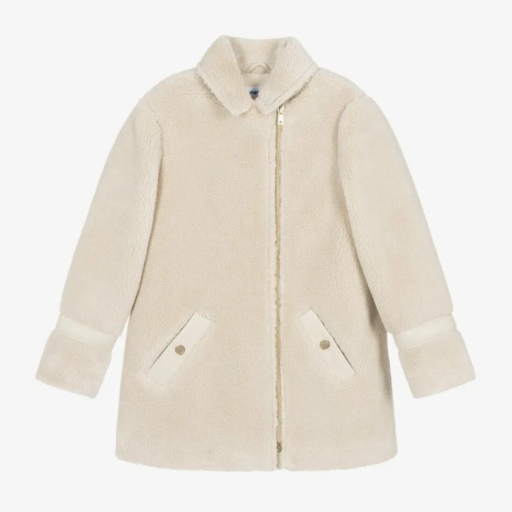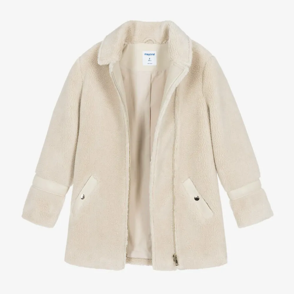 Lovely pale beige coat for older girls by Mayoral, made in super soft teddy fleece. Warm and cosy, this casual coat has beige faux leather trims on the cuffs, front pockets and on the underside of the collar for an elevated look. There are matching trims on the inside edges of the coat. This stylish piece is fully lined for comfort and fastens on the front with a gold metal zip.