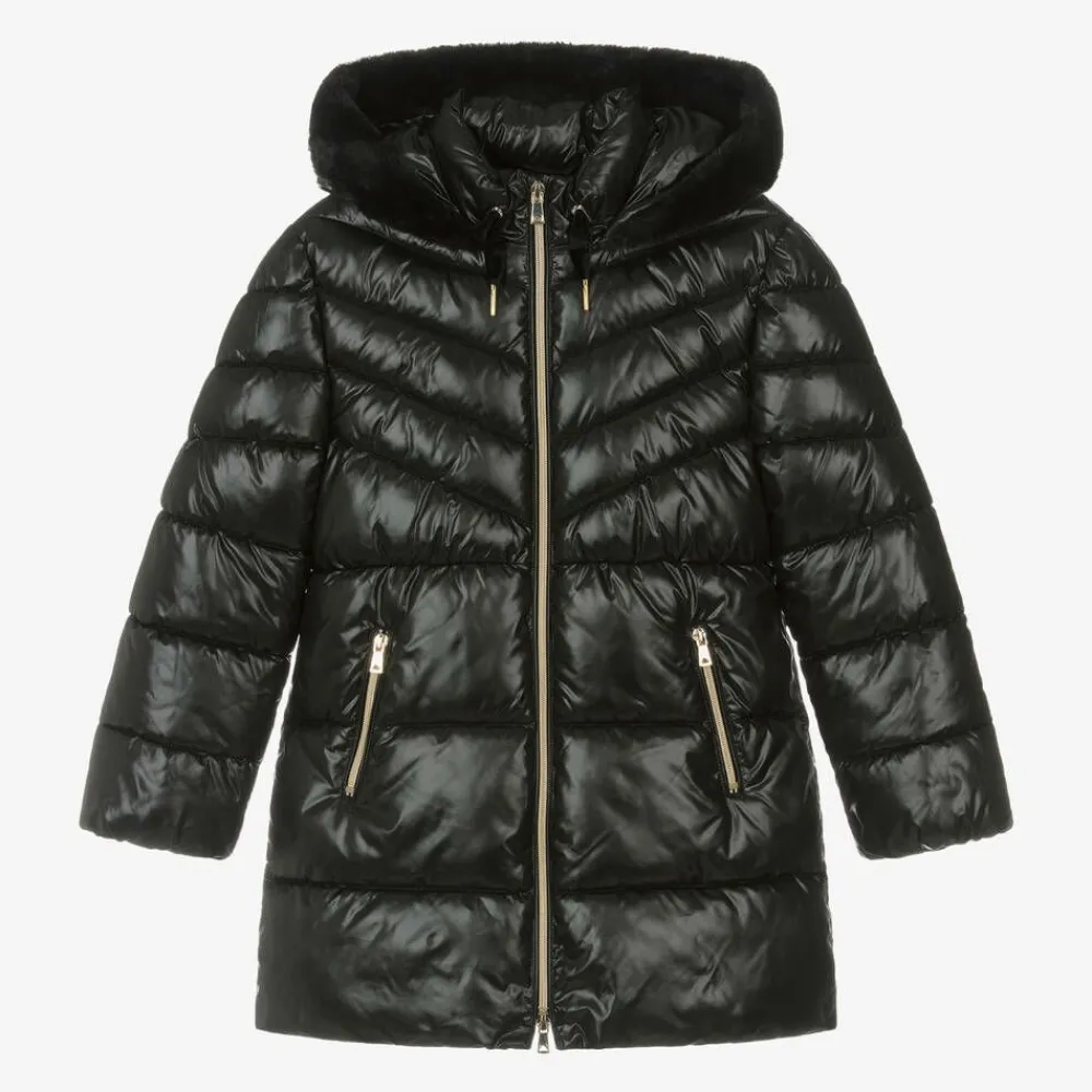 A black puffer coat for older girls by Mayoral, made in silky fabric. This cosy layer has a velvet-feel plush lining and lightweight padding for warmth. Zipping up on the front with a golden zip, it has decorative velvet drawstrings on the hood, a stylish faux fur trim, and elasticated cuffs. The zip-up side pockets are lined with plush, cosy for her hands on cold days.