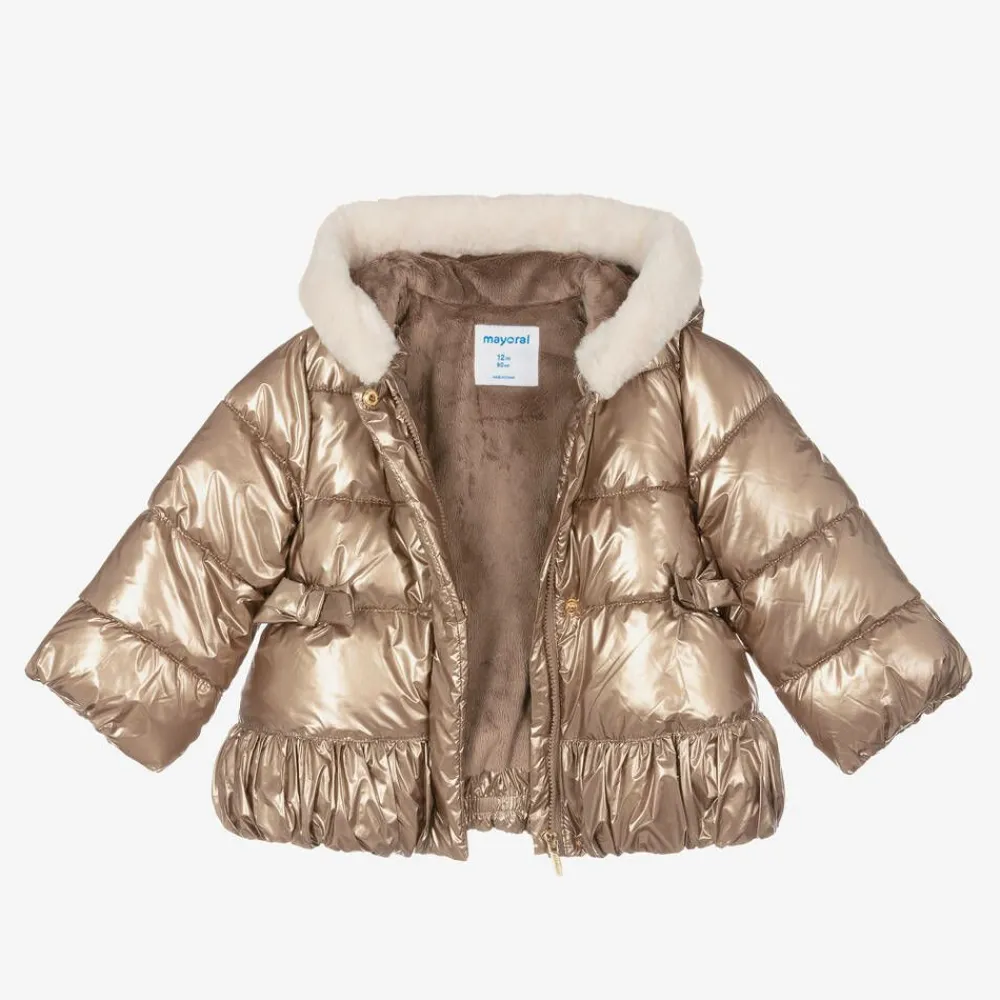 A metallic beige-gold puffer coat for little girls by Mayoral, in a silky smooth fabric. This lovely coat has decorative bows on the elasticated waist and a gold heart-shaped charm on one sleeve. It has zip and popper fastenings at the front, with a ruched elasticated hem. The hood has an ivory faux fur trim, and the coat is comfortably lined in soft plush fleece.