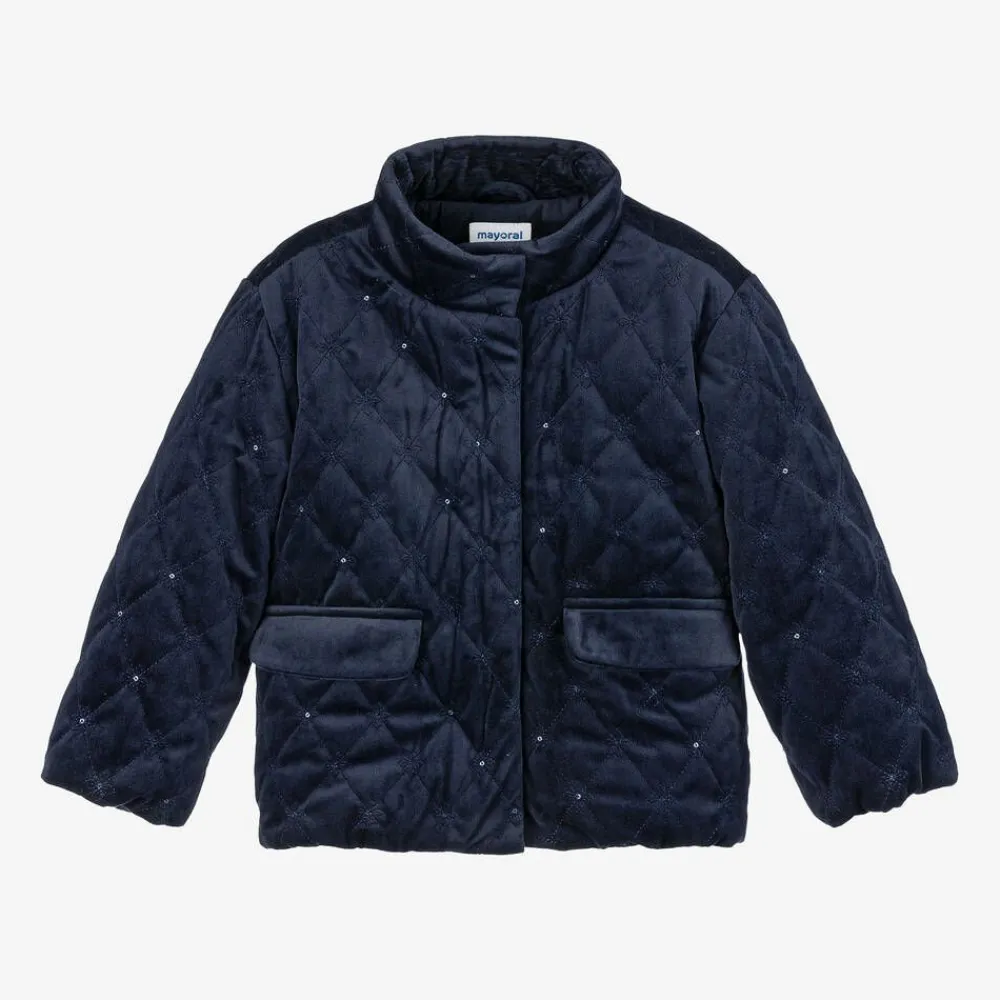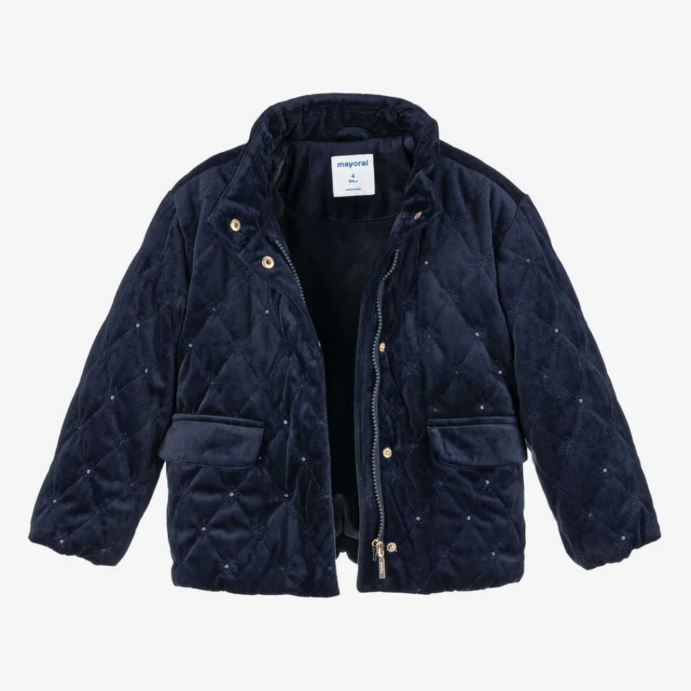 A navy blue jacket for girls by Mayoral, with popper-closing front pockets. Made in super-soft velvet, this quilted style is decorated with floral embroidery and tiny sequin detailing. Fastening with a simple-to-use zip and poppers, it is lightly padded and lined with cosy plush for warmth.