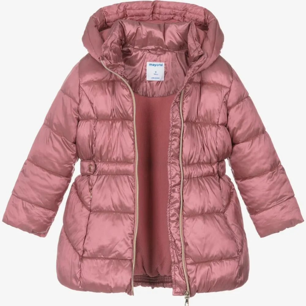 Pink puffer coat for girls by Spanish brand Mayoral, with a lustre effect and gold-tone hardware. This hooded coat is made in silky-soft fabric, padded with warm, mid-weight insulation and lined in cosy fleece, with elasticated cuffs and hemline to keep the cold out. It has a fitted, feminine silhouette with popper-fastening tabs on the sides of the waist, and useful, concealed, zip-fastening pockets on the front.