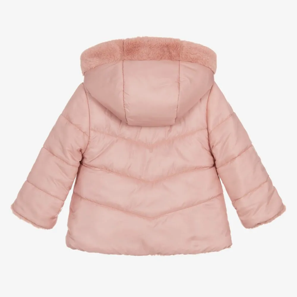 A lovely blush pink coat for little girls by Mayoral, designed with a silky smooth exterior. Great for the cooler months, this hooded outerwear piece is fully reversible and padded for extra warmth. It has two small pockets on the front, one of which is branded with a gold heart charm. The other side is made from beautifully soft faux fur for an extra cosy feel when the temperature drops.