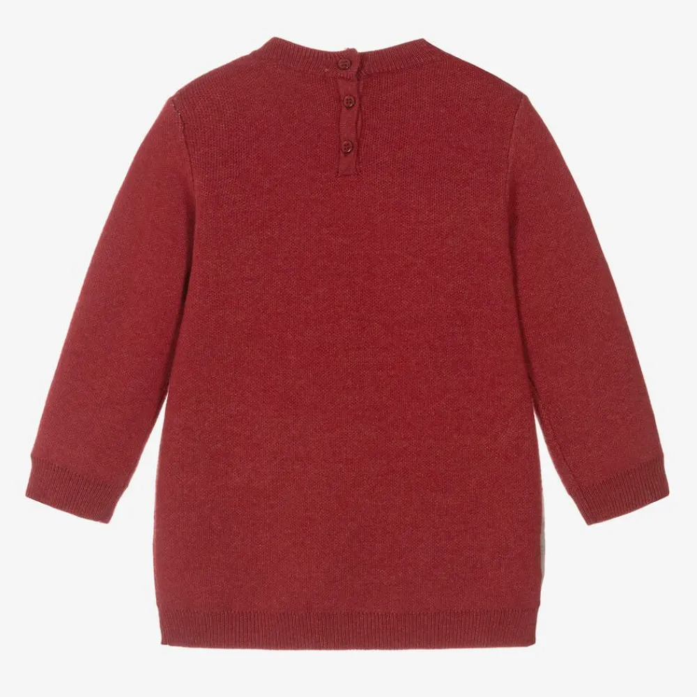 A red long-sleeved jumper dress for little girls by Mayoral, ideal for the cooler temperatures. Knitted in a super soft and cosy viscose blend, it has an adorable reindeer and bunny rabbit design on the front, with embroidered detailing and appliqué tassel and bow trims. It fastens with buttons on the back for a neat finish. This item contains recycled fibres.