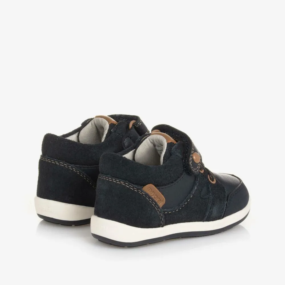 Navy blue first walker shoes for baby boys by Mayoral, made in soft, smooth leather with suede leather trims. Fully lined with soft leather these comfortable shoes have removable, antibacterial insoles and a reinforced heel and toe. They have elasticated laces for easy slip-on, a velcro strap for a secure fit and a non-slip rubber outer sole for good grip.